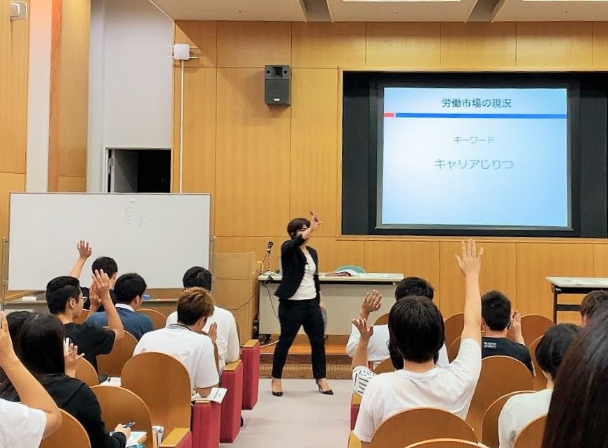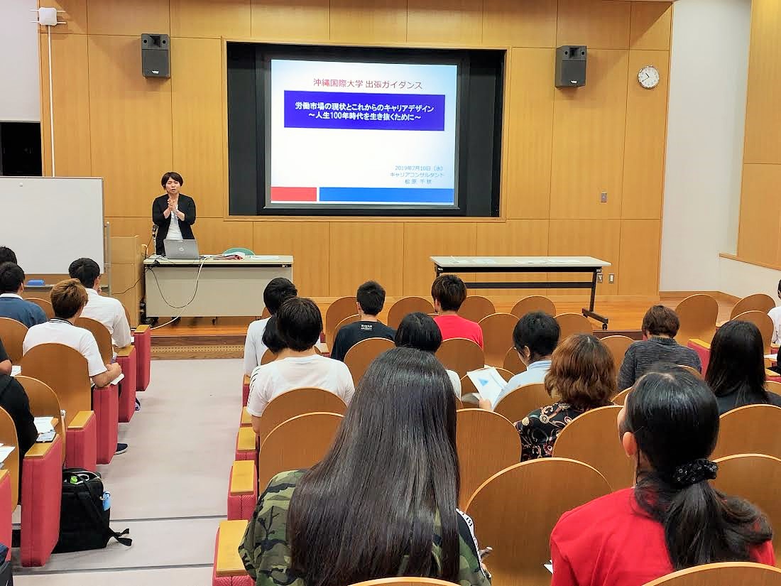 7月10日(水)に日本文化学科1年次を対象とした沖縄国際大学出張ガイダンスが行われ、「労働市場の現状とこれからのキャリアデザイン~人生100年時代を生き抜くために~」と題して、キャリアコンサルタントの松原千秋先生に講義を担当していただきました。