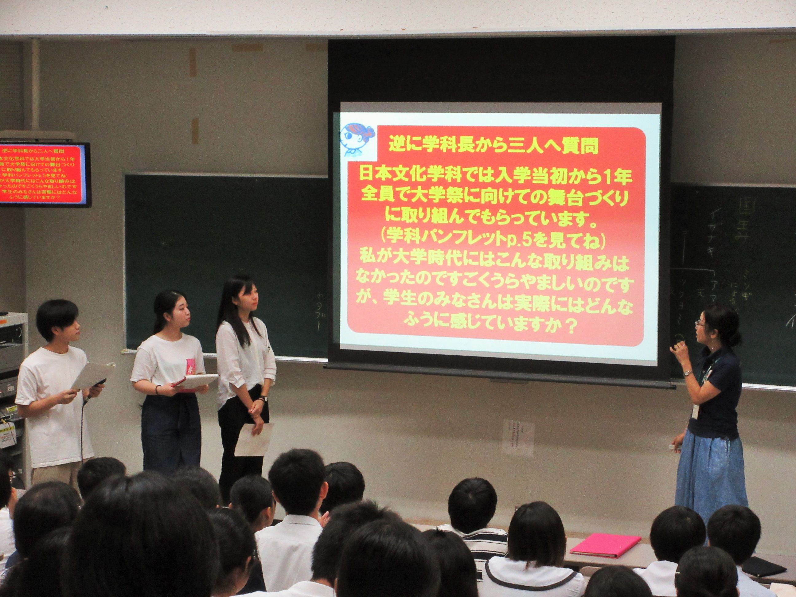 7月7日(日)に開催された第1回オープンキャンパスでは、日本文化学科2年生3名の視点で、自分が高校生だったころに知りたかったことを学科長の下地賀代子先生にいろいろ質問してみる、という形式で、学科紹介を行いました。