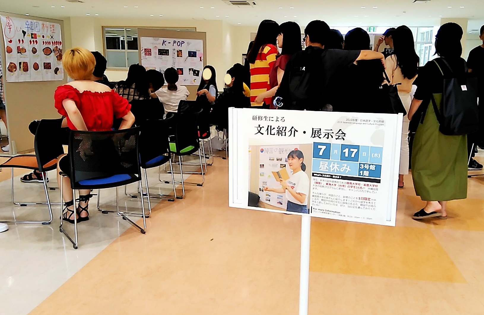 7月17日はこれまでの学習成果の発表会ということで、3号館1Fロビーにて、ポスター発表が開催され、日本文化学科の多文化間コミュニケーション研究室のみなさんが、留学生の指導をしている奥山貴之先生とともにそのサポートと見学に行ってきました。