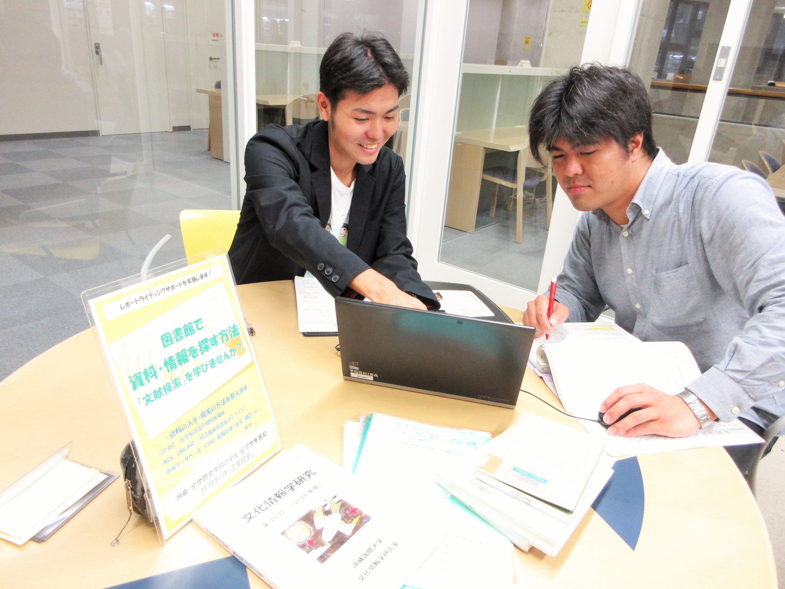 このサポートに図書館情報学ゼミに所属する4年生の代表2名が文献検索の支援者として参加し、図書館機能を活用した文献の探し方をレクチャーしてくれています。