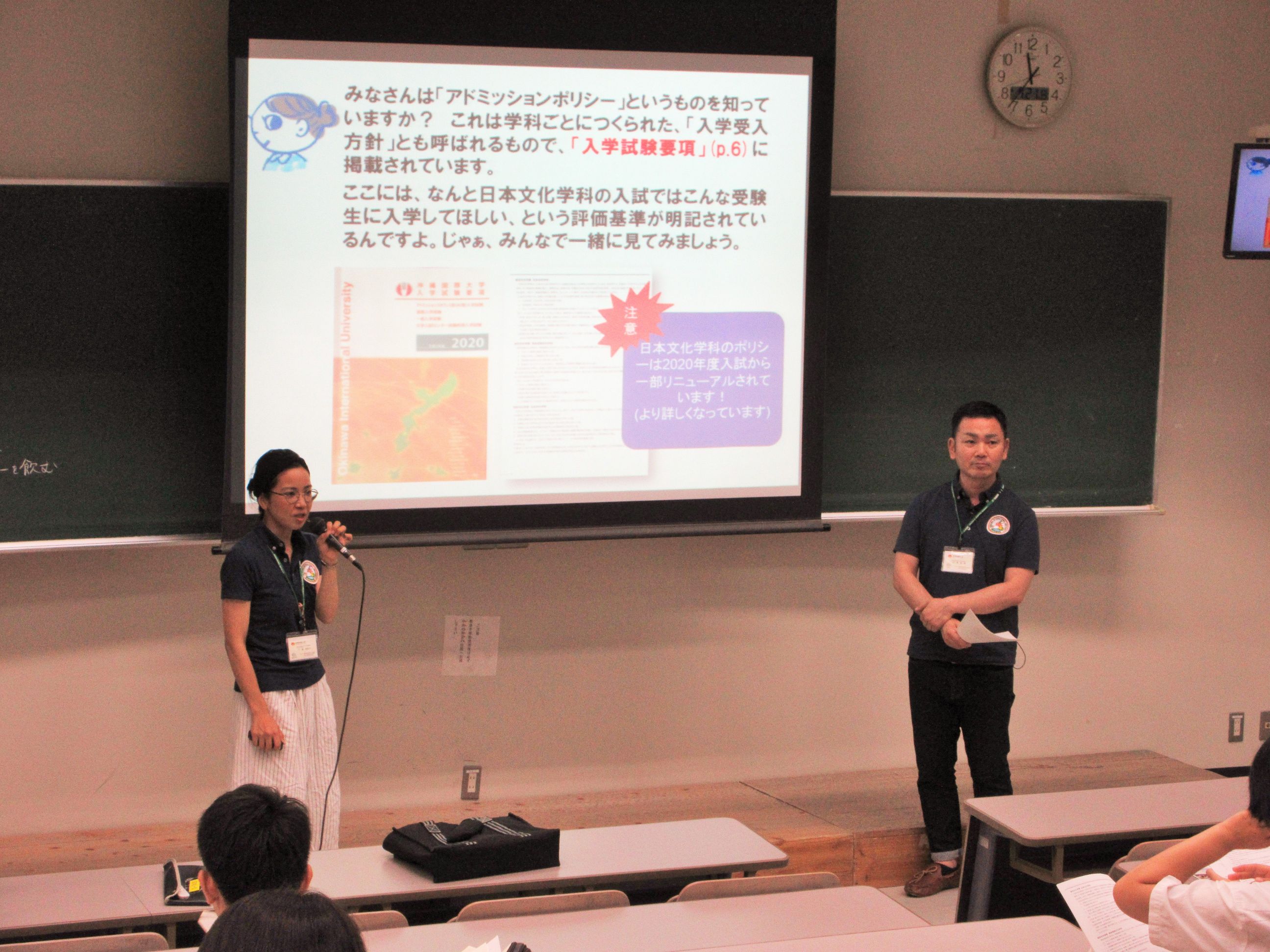 7月21日(日)に開催された第2回オープンキャンパスでは、1回目の学科紹介とは内容を変えて、学科長の下地賀代子先生と教職課程担当の田場裕規先生の司会進行で、AO入試受験生へのアドバイスを含めた、アドミッションポリシーを読み解きながら日本文化学科の特長を説明する、という形式で、学科紹介を行いました。