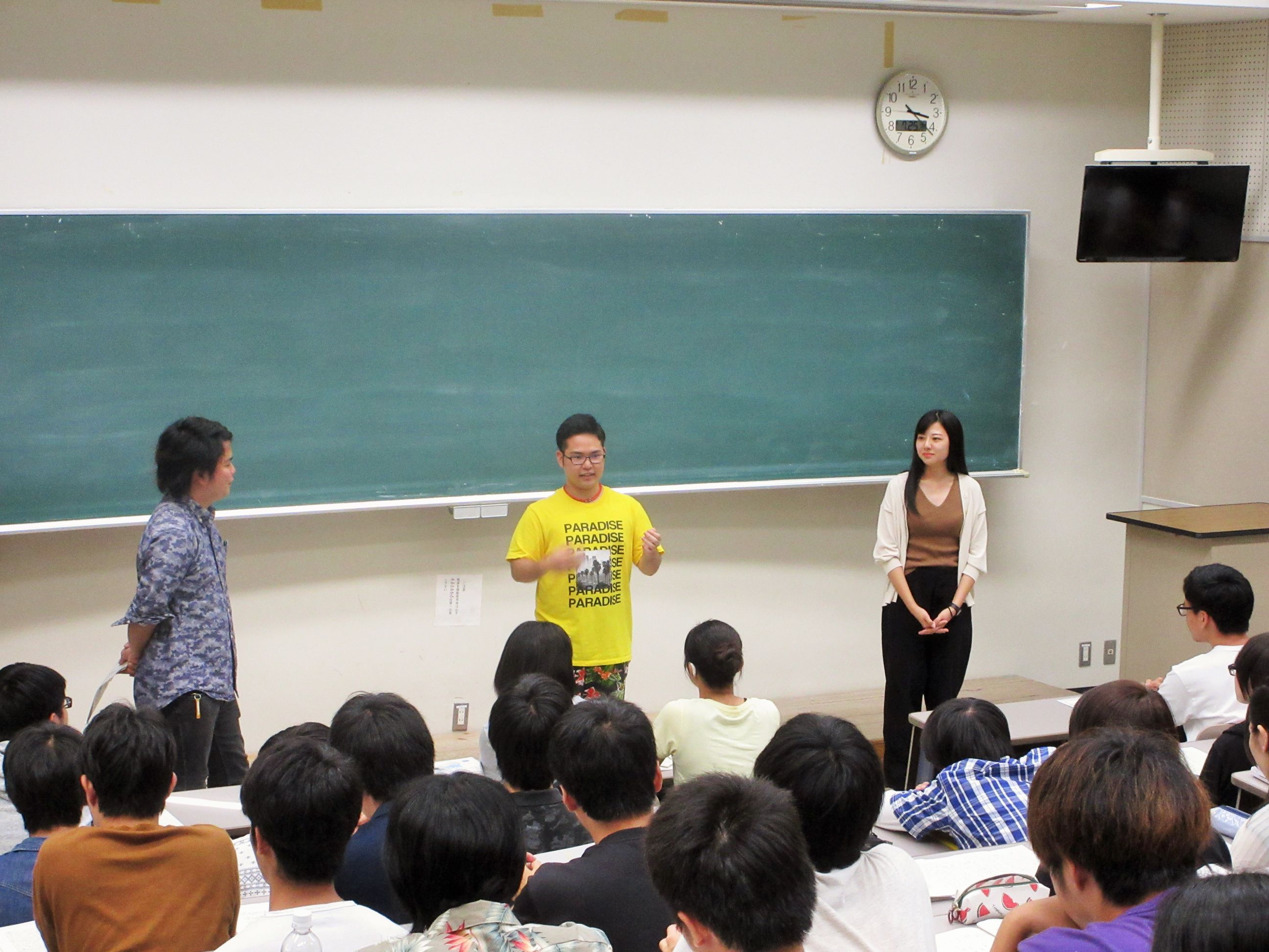 オーディションでは、第一幕・第二幕・第三幕に分かれ、キャスト候補者の2~3名ずつがアピールしていきます。身振り手振り、台詞の抑揚の付け方だけでなく、本番さながらの演技でアピールする学生もいて、「日本語表現法演習」の中で身に着けてきた個性をしっかりと表現できていたように思います。