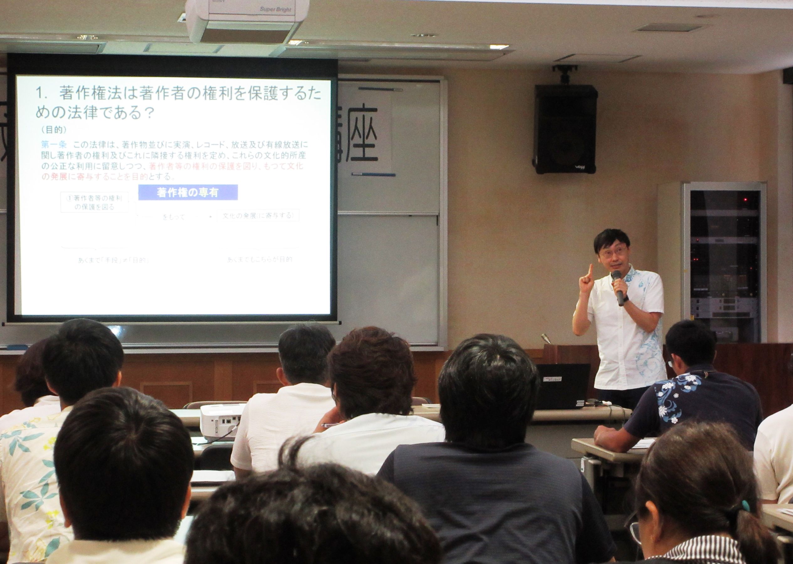2019年8月26日に開催された、沖縄県の生涯学習課が主催する「情報教育指導者等養成講座」でも、著作権をテーマとする講座を山口先生が担当し、「情報教育指導者に役立つ著作権法の基礎知識」と題した講座を行いました。