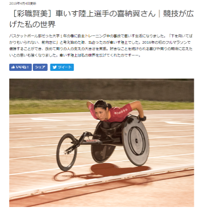 「[彩職賢美]車いす陸上選手の喜納翼さん|競技が広げた私の世界」(『週刊ほーむぷらざ』彩職賢美<1331> 第1653号 2019年4月4日掲載)