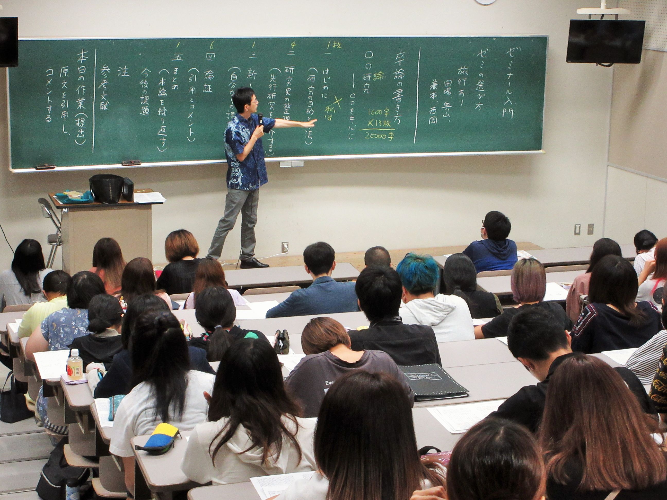日本文化学科には、2年生の必修科目として「ゼミナール入門」という科目があります。毎回、各先生が研究室での研究内容をさまざまな趣向を凝らしてプレゼンし、2年生のゼミ選択の参考にしてもらっています。
