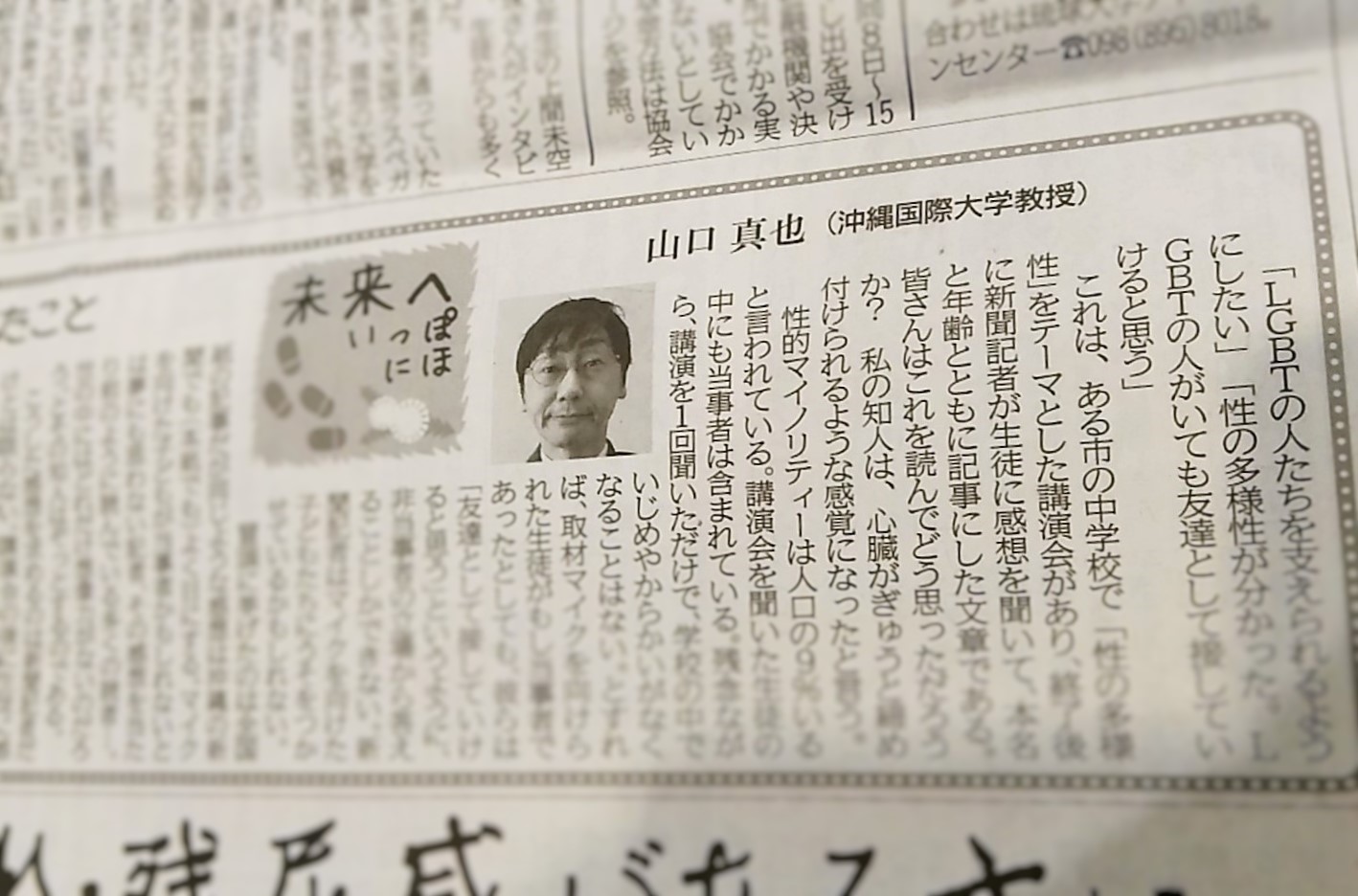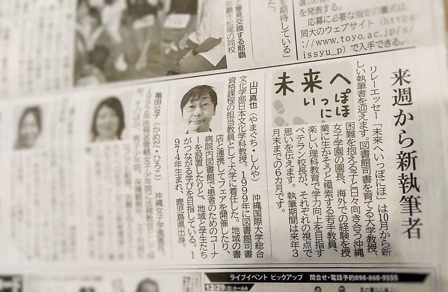 『琉球新報』毎週金曜日に掲載されている教育関係者によるリレーエッセイ「未来へいっぽにほ」。10月から新しい執筆者に交代し、週替わりでエッセイを担当する執筆者の1人に、日本文化学科で図書館学の授業を担当している山口真也先生も加わることになりました。