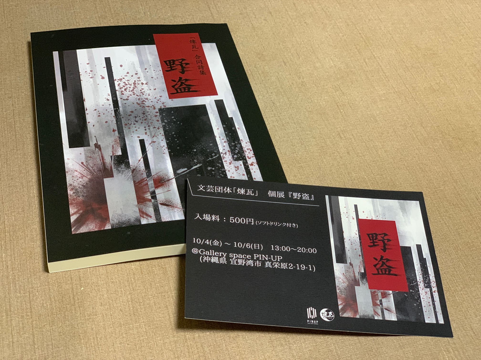 沖縄国際大学日本文化学科かの在学生と卒業生が中心となって活動している文芸団体「煉瓦」のみなさんが、10/4~10/6の3日間、宜野湾市真栄原のギャラリースペースPIN-NUPにて個展『野盗』を開催しました。