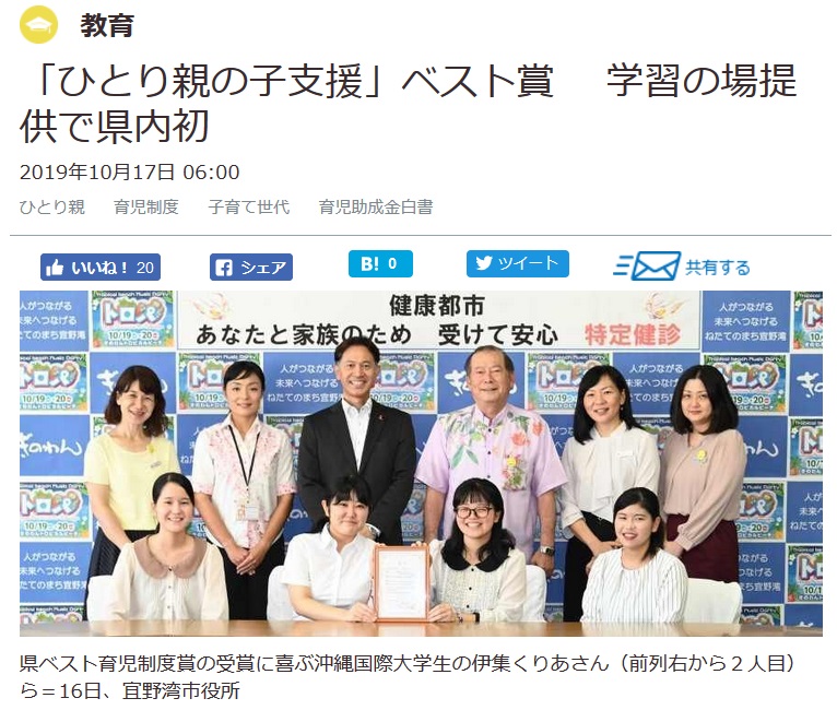 「琉球新報ーー「ひとり親の子支援」ベスト賞 学習の場提供で県内初」(2019年10月17日 06:00配信)