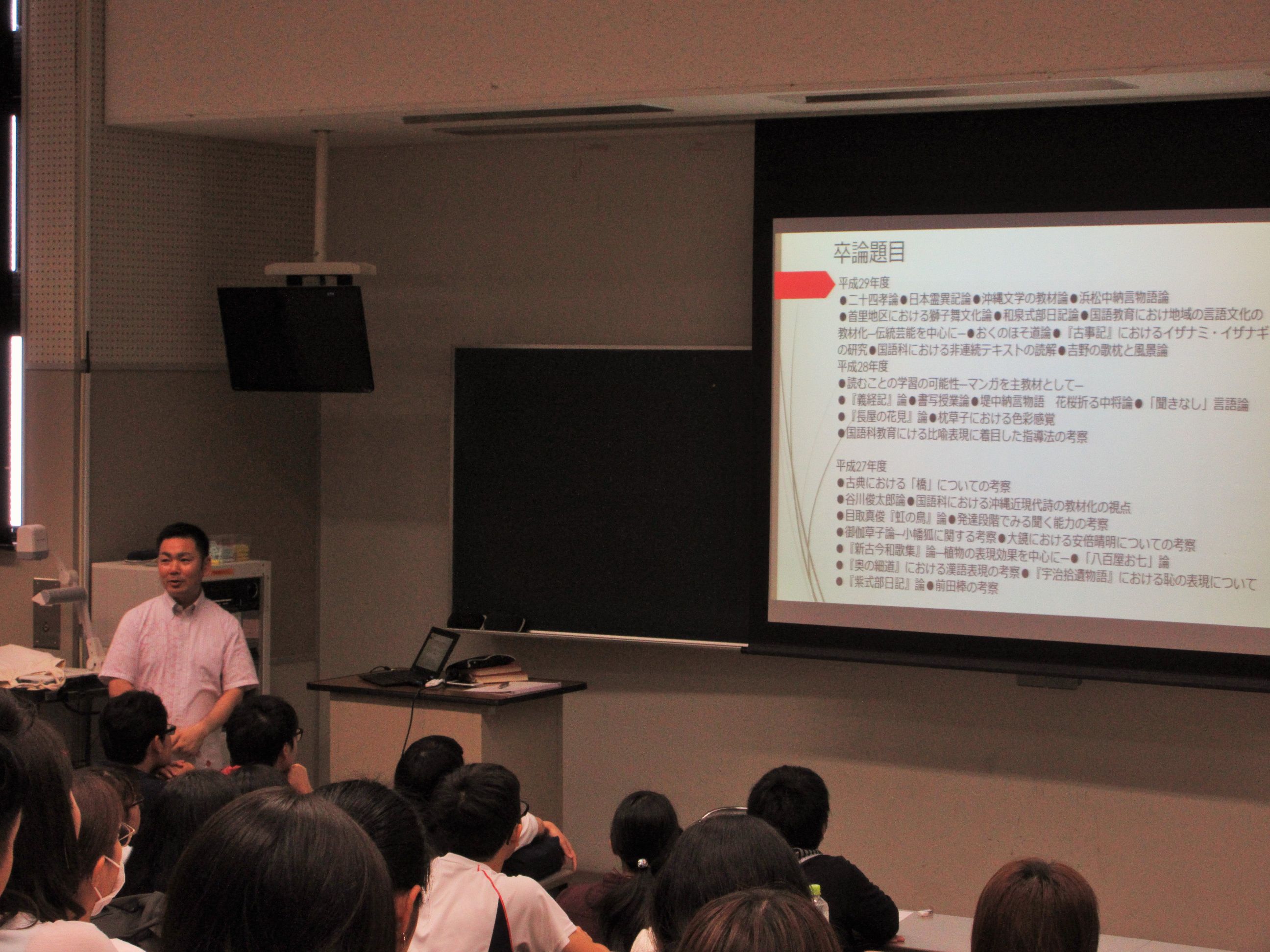 田場先生の研究室では、国語教育・古典文学の研究を行っています。また、沖縄の文化について研究することもできそうです。教育問題と琉球文化やしまくとぅばを組み合わせた研究を行っているゼミ生もいるそうです。