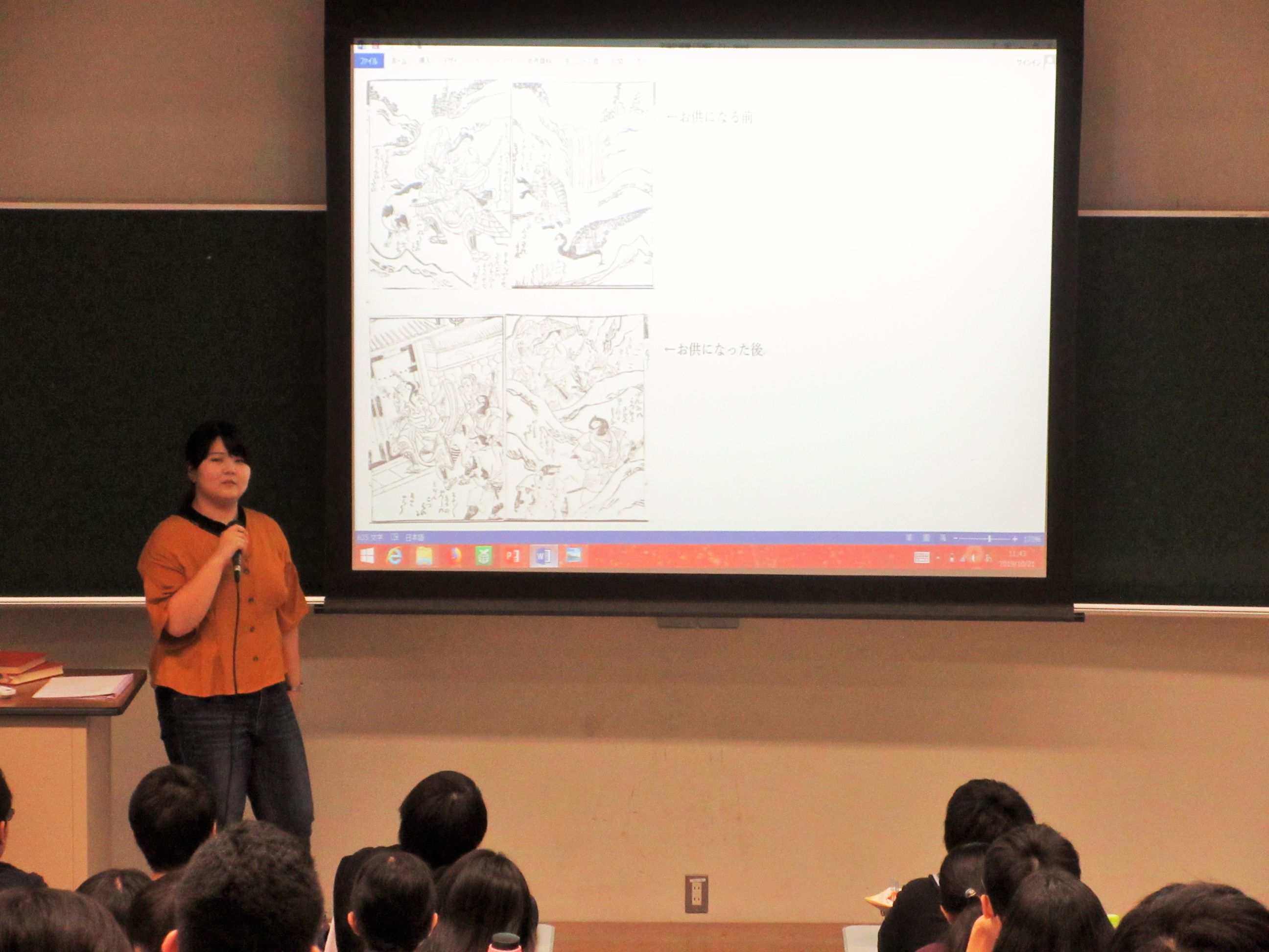 日本文化学科には、2年生の必修科目として「ゼミナール入門」という科目があります。毎回、各先生が研究室での研究内容をさまざまな趣向を凝らしてプレゼンし、2年生のゼミ選択の参考にしてもらっています。