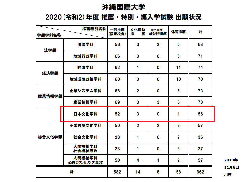【11月15日に実施される推薦入試の志願者数が発表されました! 日本文化学科の志願者数は56名です】