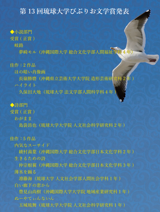 【第13回琉球大学びぶりお文学賞にて、日文2年生・3年生が詩部門で佳作を受賞しました!】