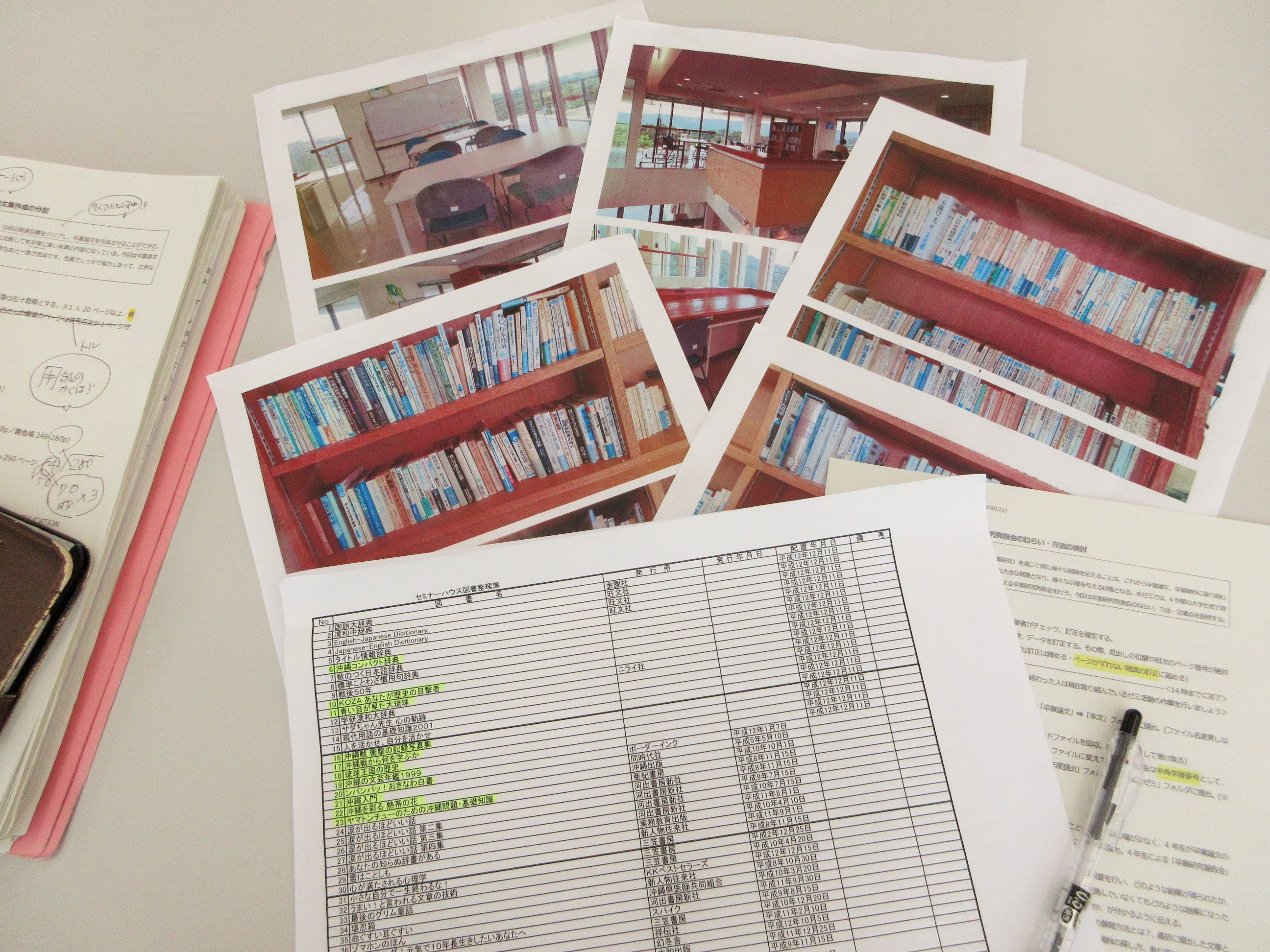 昨年合宿に行った時の写真や、最近合宿にいったほかのゼミの学生さんに依頼して撮影してもらった写真などを使って、現在の蔵書を確認したり、入口から図書コーナーまでの動線をチェックしたり。
