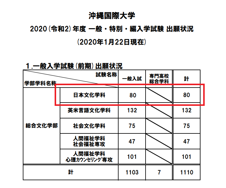 2020年2月4日・5日に実施される、沖縄国際大学一般入試の出願状況が沖縄国際大学サイトにて発表されました。