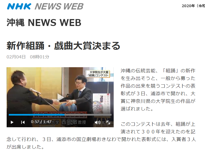 【西岡敏先生が奨励賞受賞「新作組踊・戯曲大賞」の授賞式の様子がNHKサイトでみることができます!】