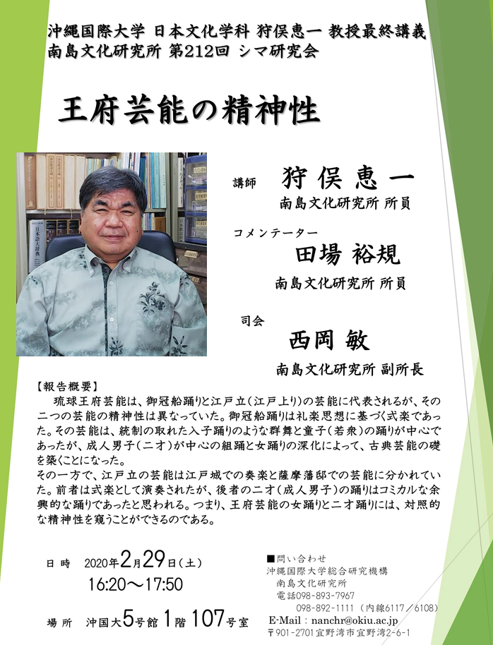 2020年3月31日で沖縄国際大学を定年退職される狩俣恵一先生。在職中に副所長も務められた南島文化研究所第212回シマ研究会「王府芸能の精神性」が開催されることになりました。
