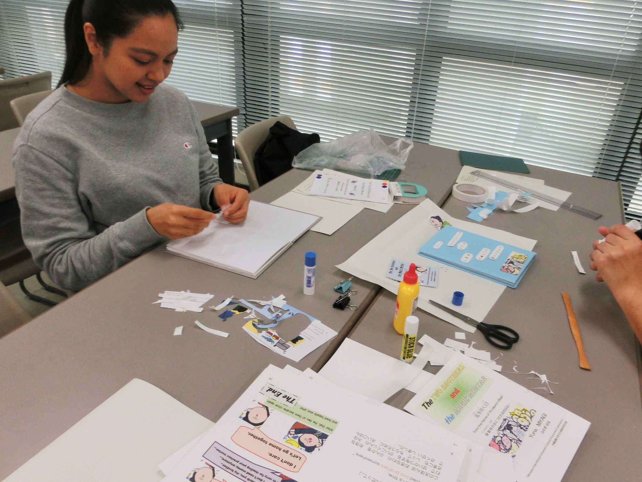 2020年2月8日の授業では、最後の総仕上げということで、グループごとに1年間かけてつくってきた手作り絵本を製本する作業を行いました。