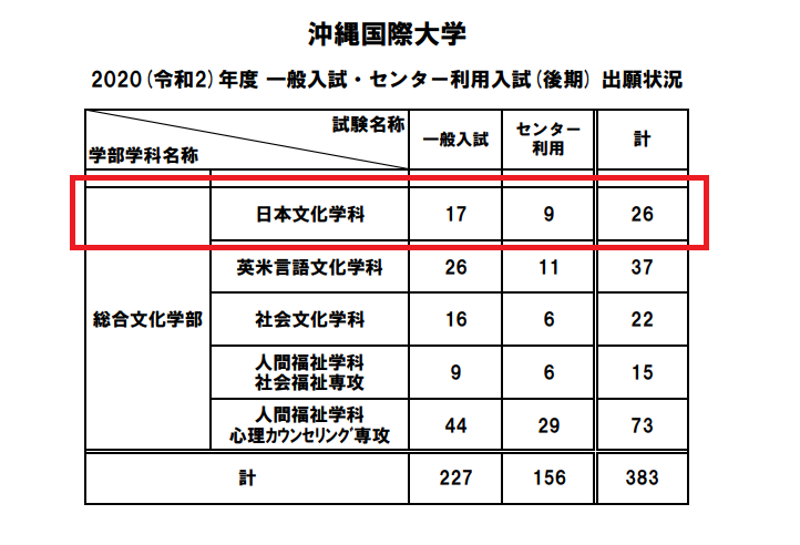 2020年3月3日に実施される、沖縄国際大学の後期一般入試とセンター利用入試後期日程の出願状況が大学サイトで発表されています。