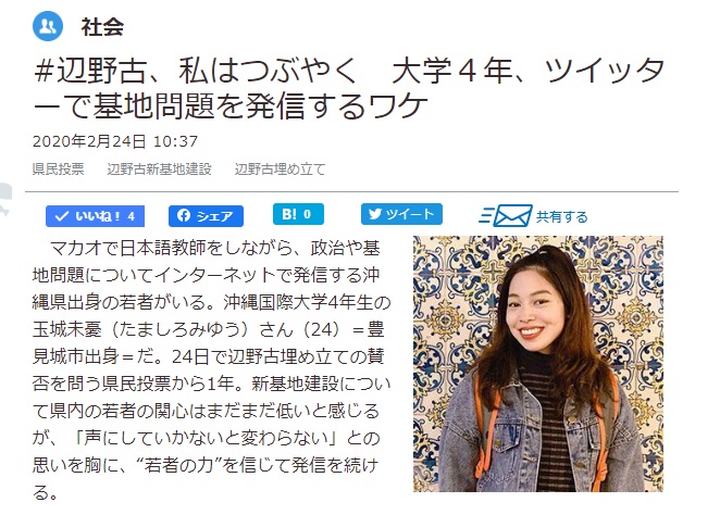 「#辺野古、私はつぶやく 大学4年、ツイッターで基地問題を発信するワケ」(2020年2月24日 10:37配信)