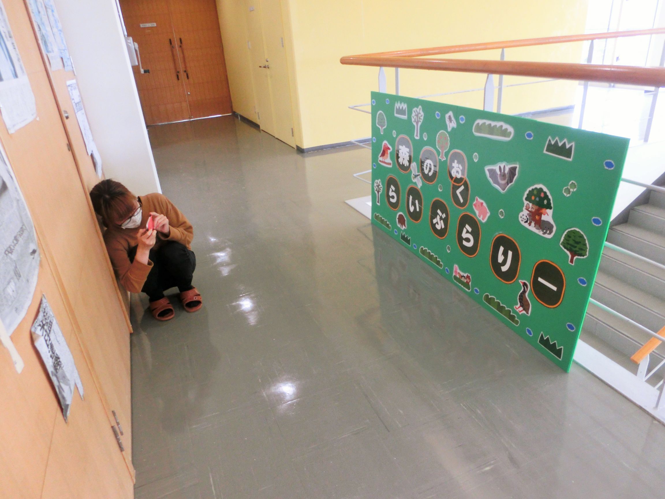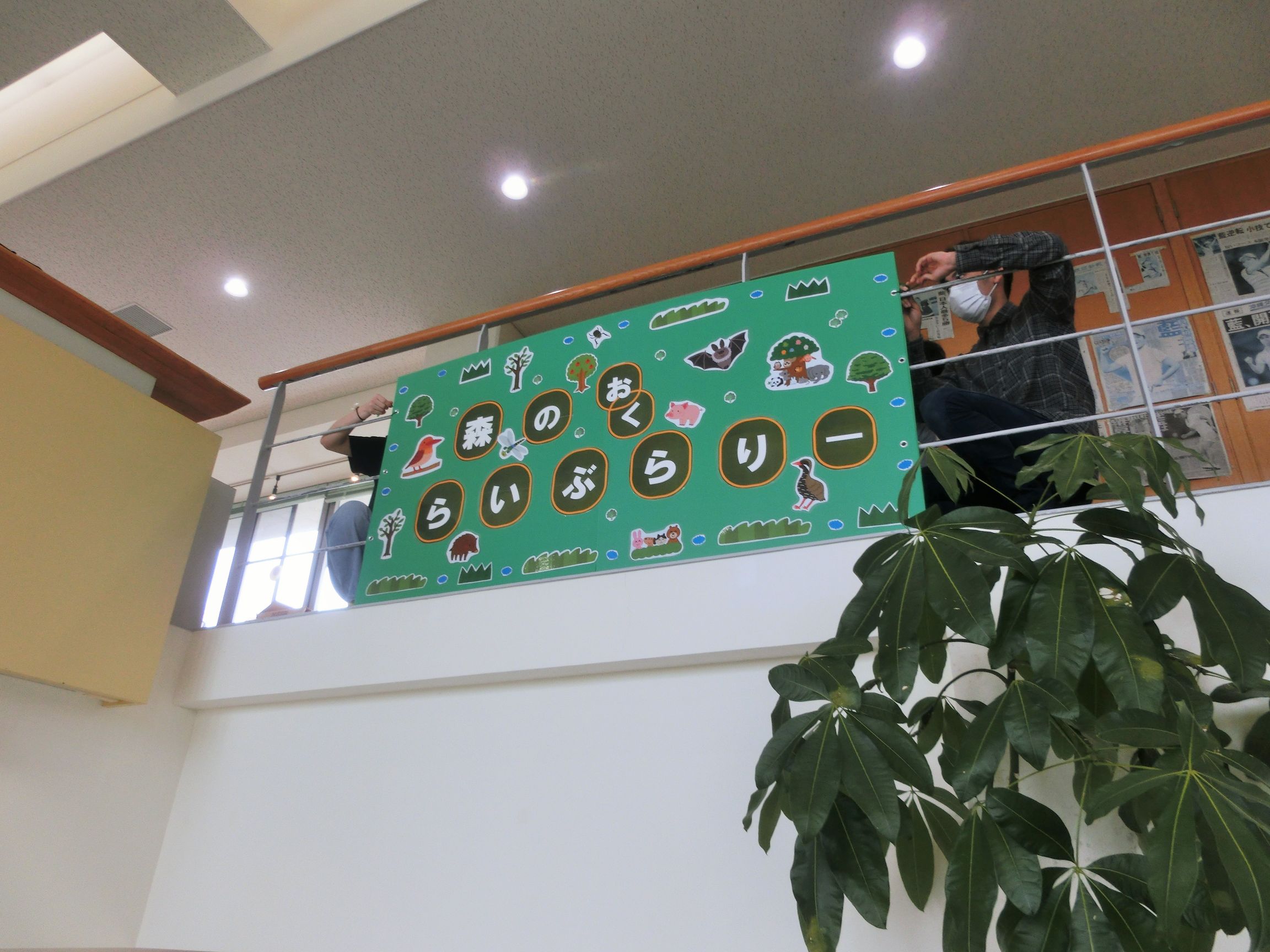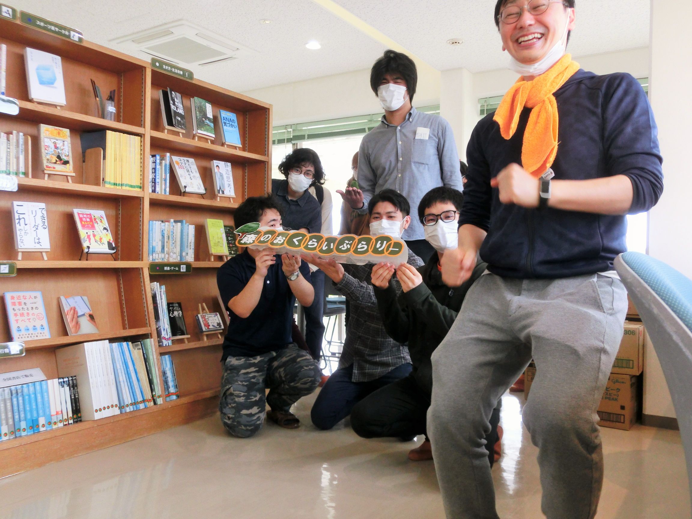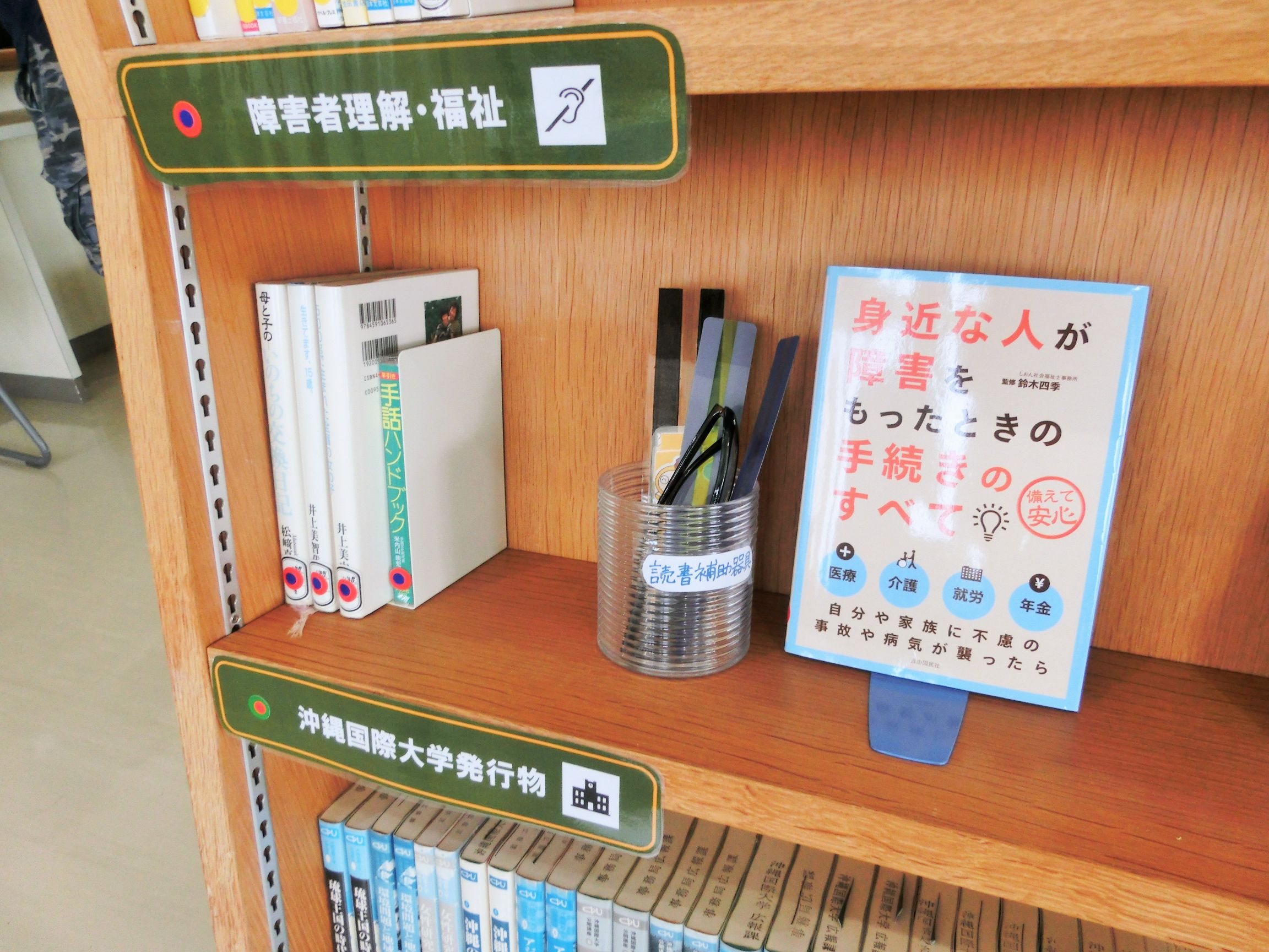 という4つの企画を立てて、「森のおくらいぶらりー」という名称をつけて、2Fのエントランスからもすぐに図書コーナーがあることを伝えるための大型サインパネルを設置、発行後20年以上経過している古い資料の廃棄と新規購入、12個のカテゴリ分けによる書架分類、読書補助器具として老眼鏡やリーディングトラッカーの配置、ピクトグラムを使用した分類サインの設置、などを行いました。