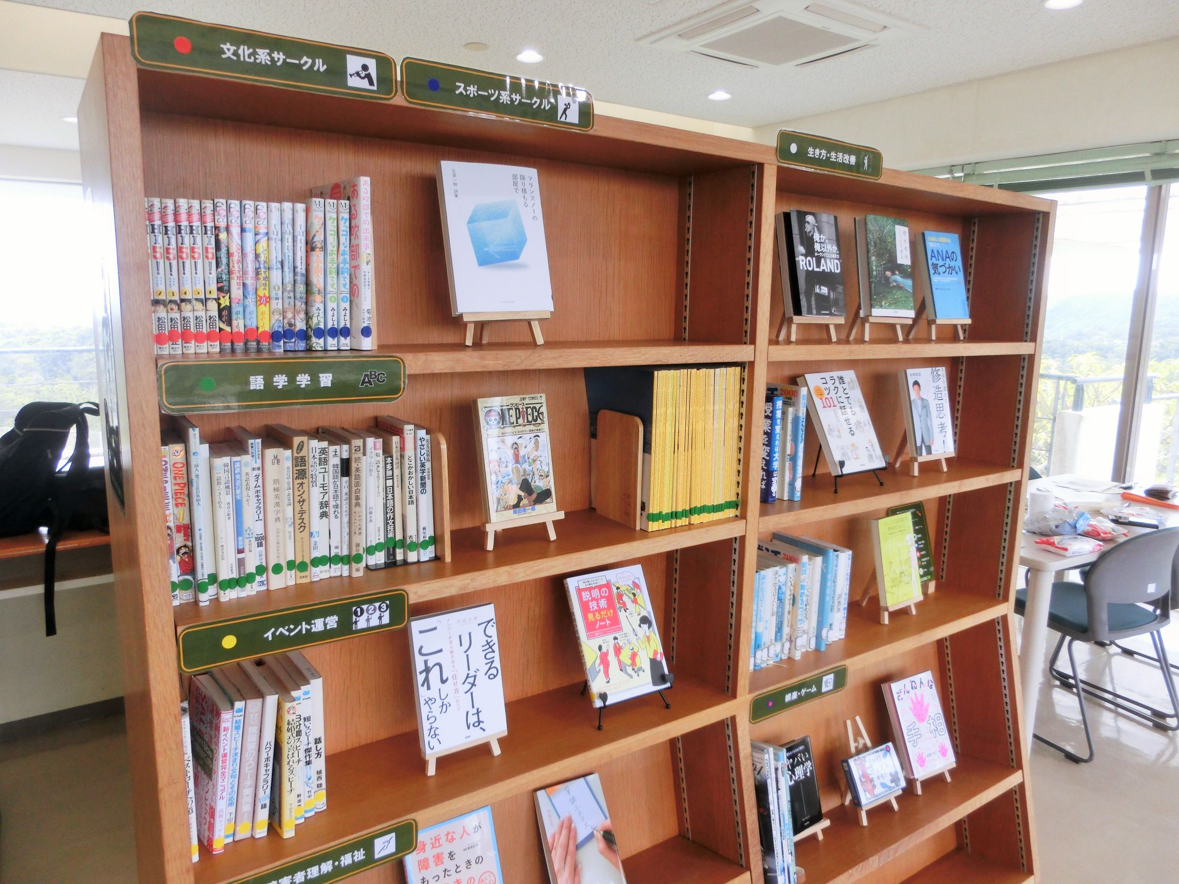 <棚ごとにテーマを分けて本を並べて書架サインを設置しました。写真を見て気づきましたが、山口先生がスポーツ系サークルと文化系サークルの書架サインの分類シールを貼り間違えてしまいました_(._.)_>