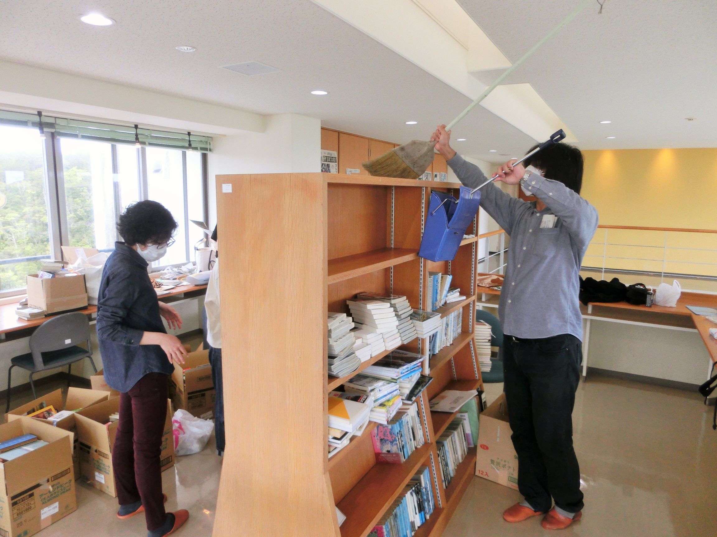 <書架の上にも、本にも大量のほこりがつもっていたのでお掃除しました>