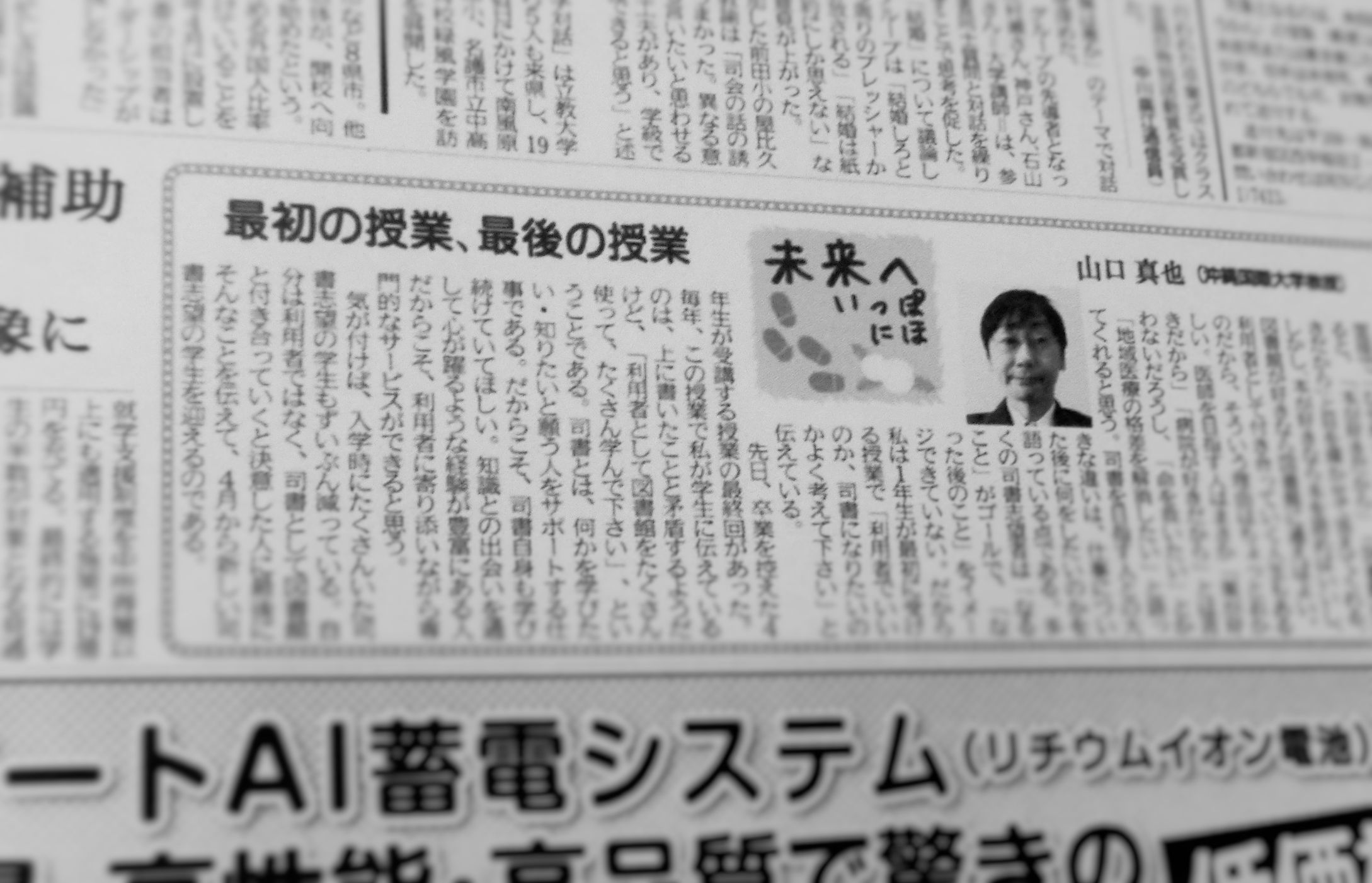 『琉球新報』の教育欄に毎週金曜日に掲載されているリレーエッセイ「未来へいっぽにほ」。日本文化学科で図書館情報学と司書課程の授業を担当している 山口 真也先生も月に1回の連載を担当していて、2月28日に6回目(最終回)のエッセイが掲載されました。
