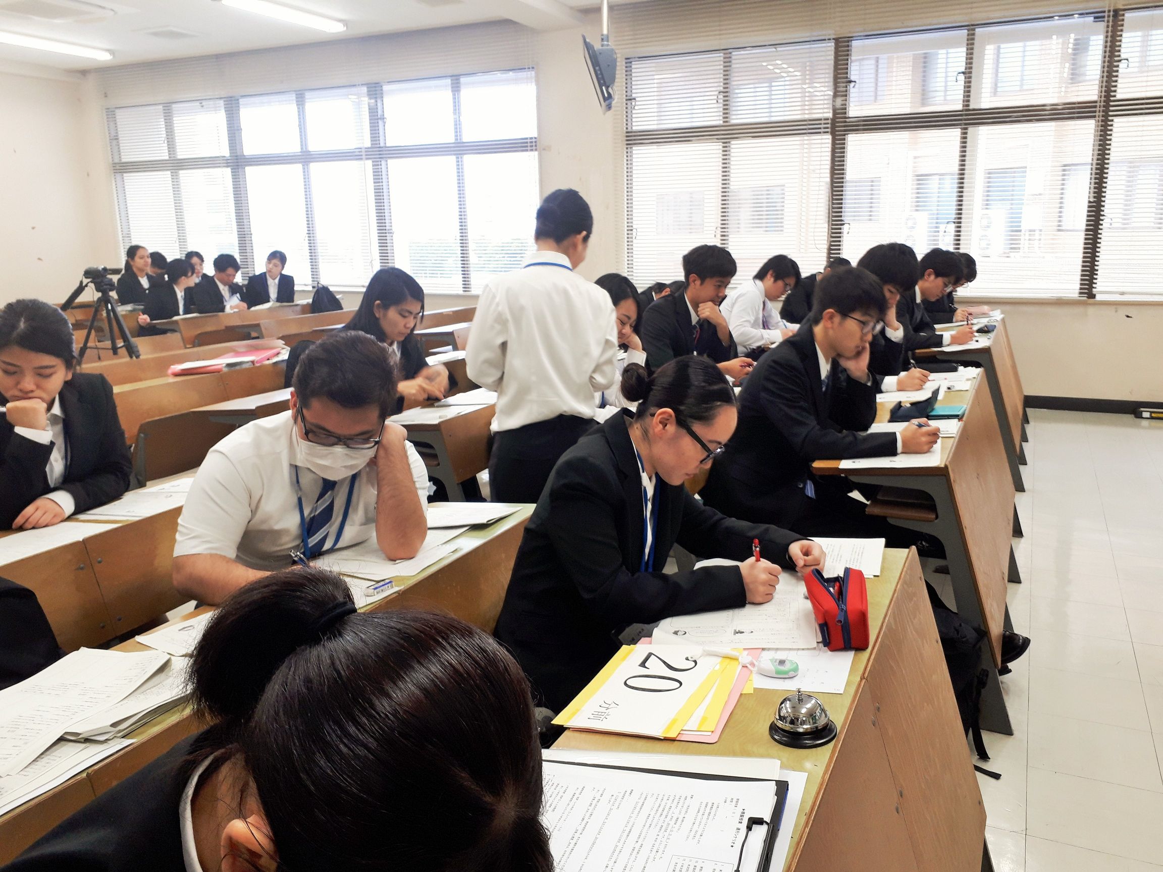 日本文化学科の教職課程では、年に2回、秋期と春期に教職履修生全員を対象とした模擬授業が行われています。これは、教育実習を受ける前の3年次が、中高の教科書から1教材を選択し、素材研究(教材研究)、指導案や板書計画、学習プリントの作成を行い、全員の前で授業を行うものです。