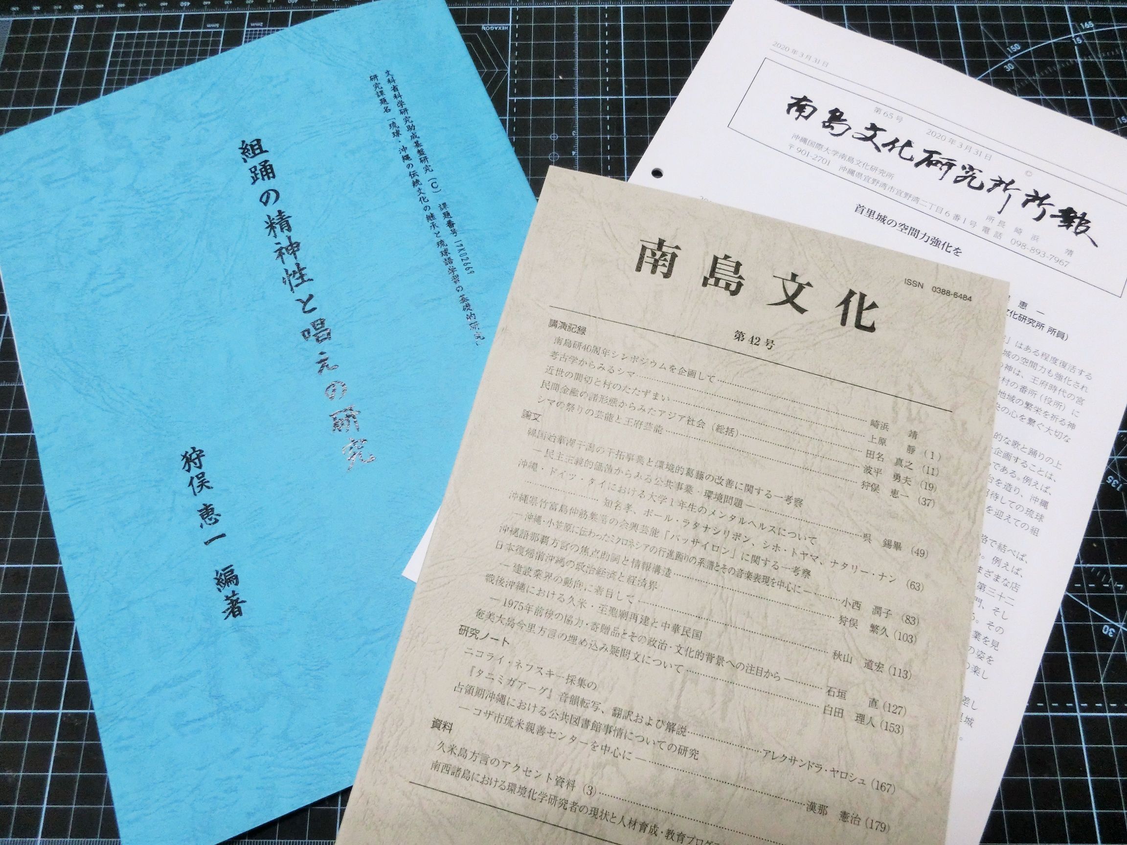 他にも、沖縄国際大学南島文化研究所が発行する学術誌である『南島文化』第42号にも、狩俣先生がご寄稿された講演記録「シマの祭りと王府芸能」が収録されています。さらに、『南島文化研究所所報』第65号にも、「首里城の空間力強化を」と題するエッセイも掲載されています。