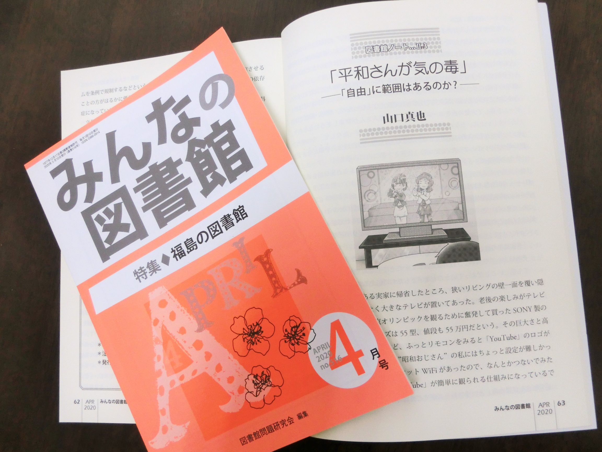 年末年始に、Youtubeで1980年代の歌番組やバラエティ番組をみながら、あまりのばかばかしさに「平和だなぁ」とつぶやいたとことをきっかけに、平和教育のあり方に想いをはせつつ、図書館での資料収集・提供の問題になりやすい娯楽性が高すぎる資料(テーマ性がないギャグマンガなど)の扱いはどうあるべきか、連載エッセイのテーマになっている「図書館の自由」に掲げられた「自由」の範囲をめぐって思うことがあれこれと書かれています。