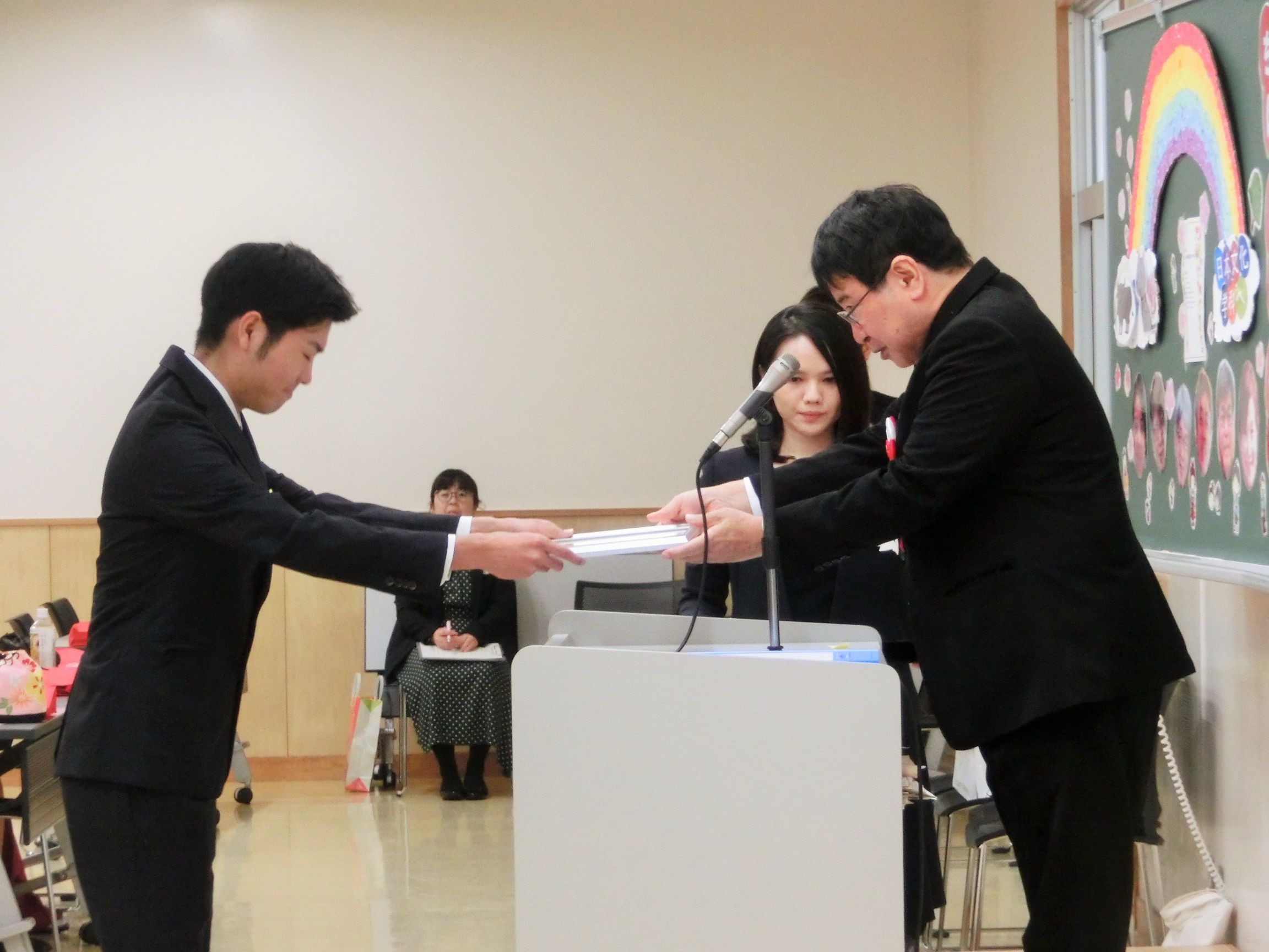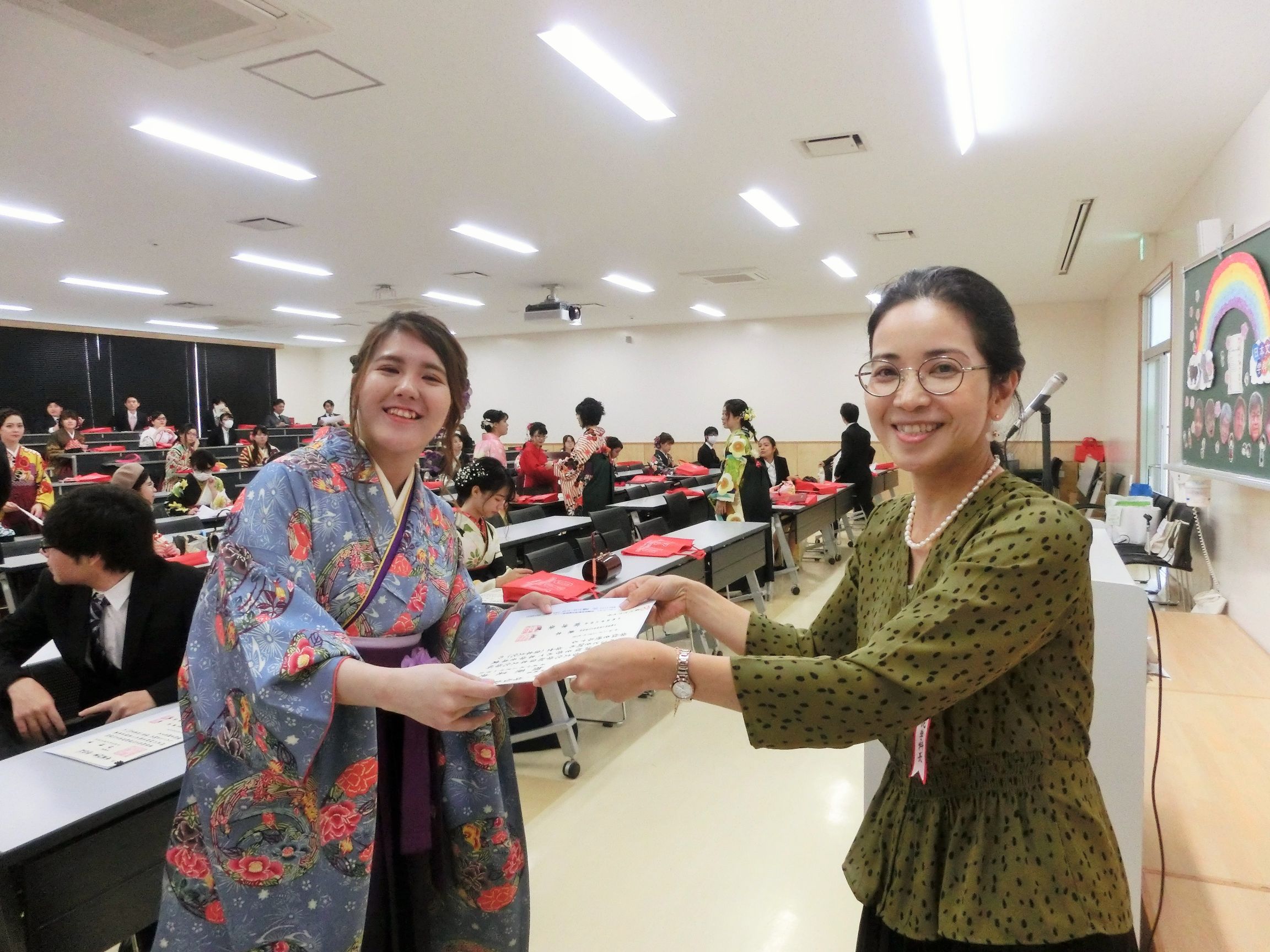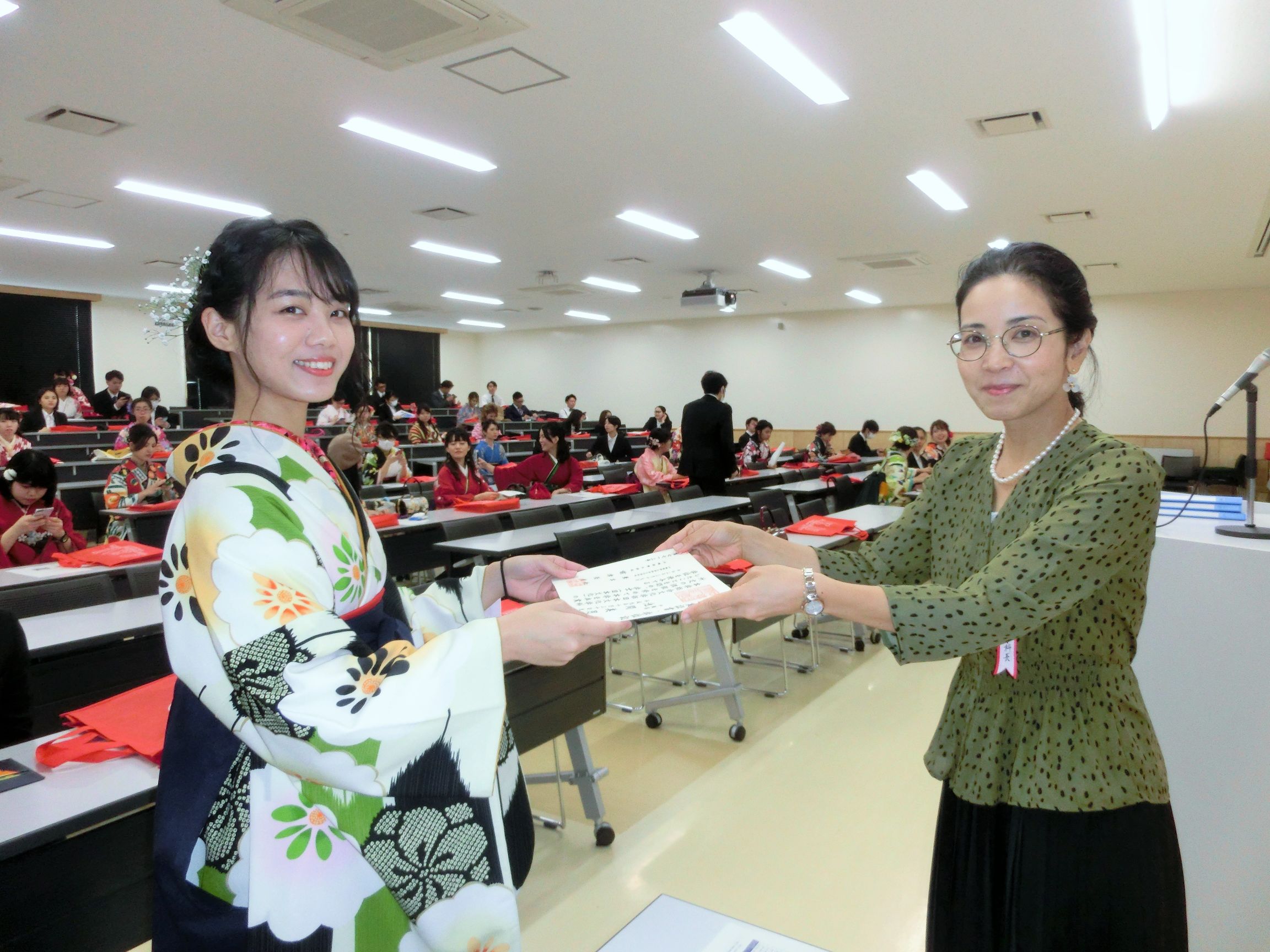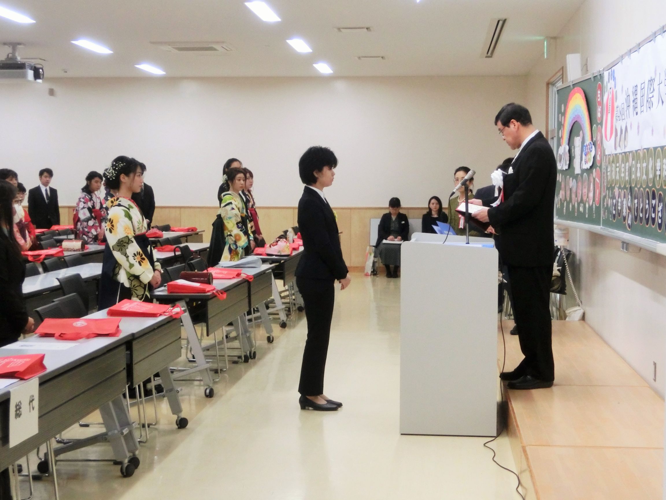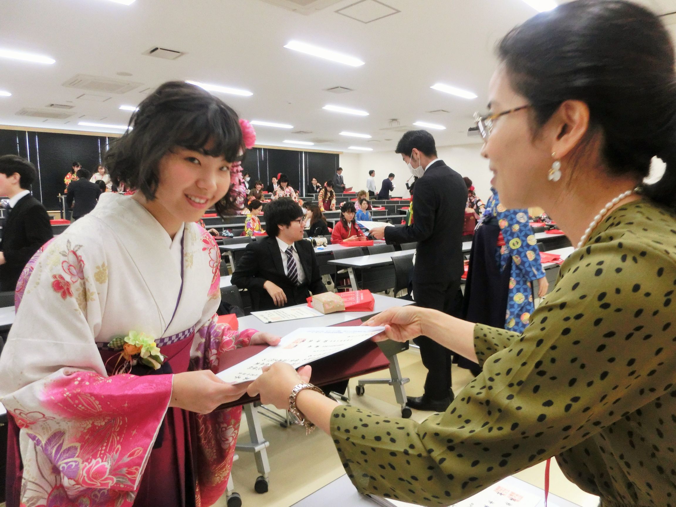この日の卒業式では、前津栄健学長の送辞のほか(全学科の教室を回ってくださいました!)、成績優秀者として総代をつとめた宮里さんへの卒業認定、図書館司書採用試験現役合格者として学部長賞を受賞した宮城さんへの賞状と記念品の授与のあと、1人1人に下地賀代子学科長と、教職課程担当の桃原千英子先生より証書の授与が行われました。