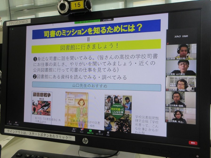 「本が好き」は図書館司書を目指す理由にならない、図書館司書の「ミッション」が何かを探して興味を持てるかどうか考えよう、と山口先生が高校生に呼び掛けていました。質疑応答では、現代に電子書籍などが普及していることから、図書館・図書館司書の将来についての疑問などが寄せられていました。