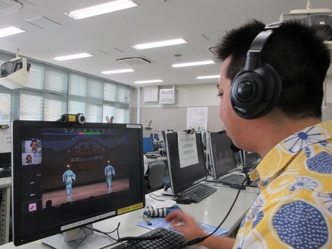 初めに、学科長の下地先生から学科紹介があり、その後、琉球文化コースの我部先生が琉球舞踏を学ぶことについてお話しました。同じく琉球文化コースの西岡先生もサポートに入って、琉球舞踊と「ことば」についてお話しました。琉球舞踏は、その成立時期や踊られる場面によって、いくつかの種類に分類できるそうです。琉球舞踏について学ぶ際は、そうした背景的なことを学ぶこと、舞踏を見る・聞く・考える、それぞれ大切で面白さがあるそうです。西岡先生がとても楽しそうに琉球文化や「ことば」のことを話しているのが印象的でした。