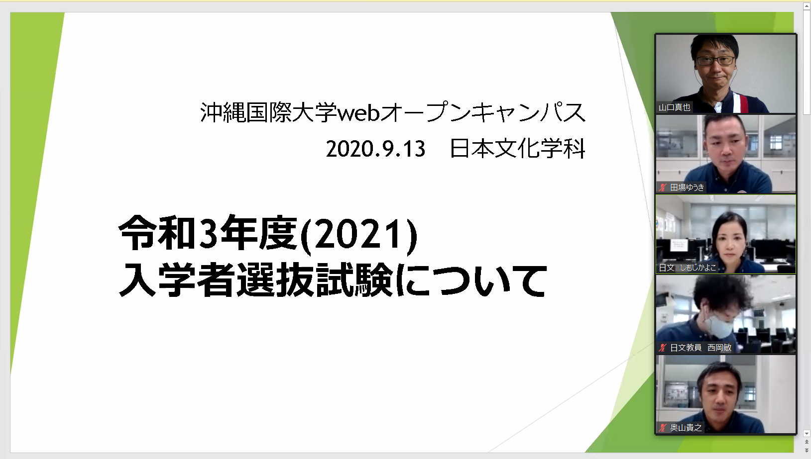 当日参加した下地学科長(日本語学担当)、西岡敏先生(琉球語担当)、田場裕規先(古典文学・国語教職担当)、奥山貴之先生(多文化・日本語教育担当)、山口真也生先生(図書館司書担当)からの質問への回答をご紹介します。