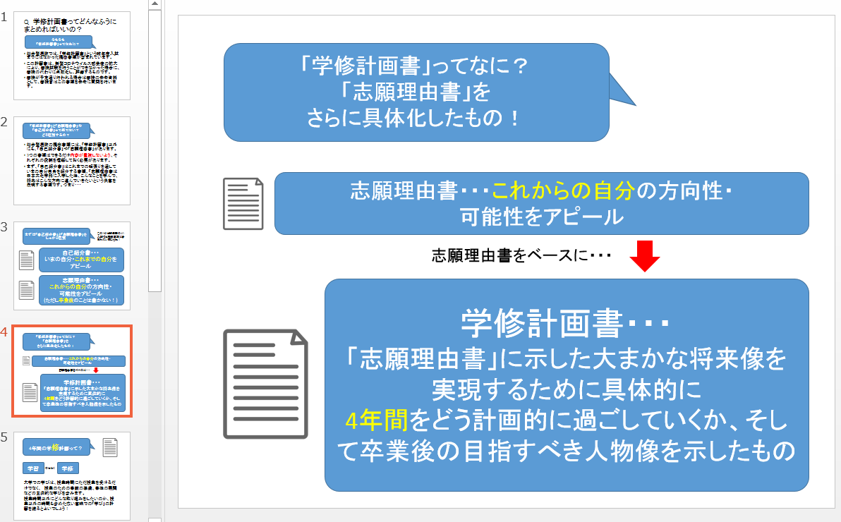 →「はい、志願理由書にも卒業後の目標、こういう仕事をしたいということはぜひ書いてくださいね。ただ、その仕事を通してどう社会貢献したいか、ということは学修計画書の方に書く欄があるので、そこは重複しないようにするとよいでしょう」(山口先生)