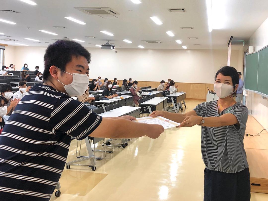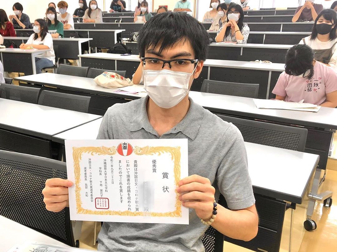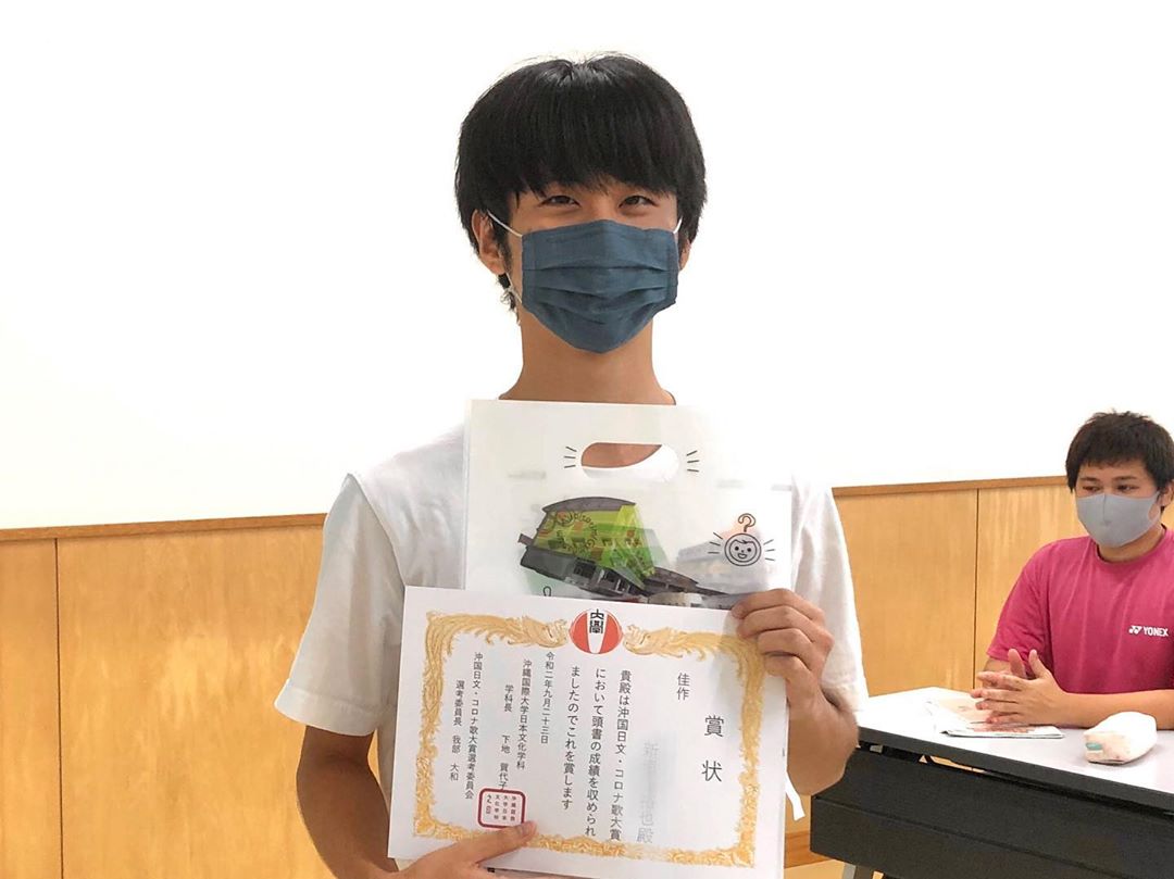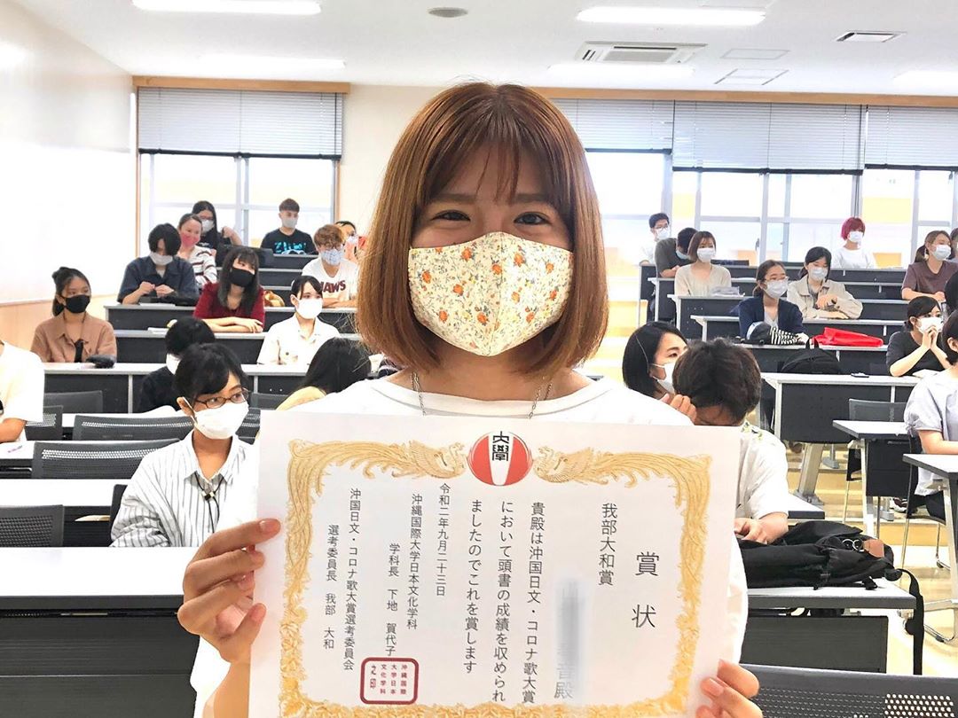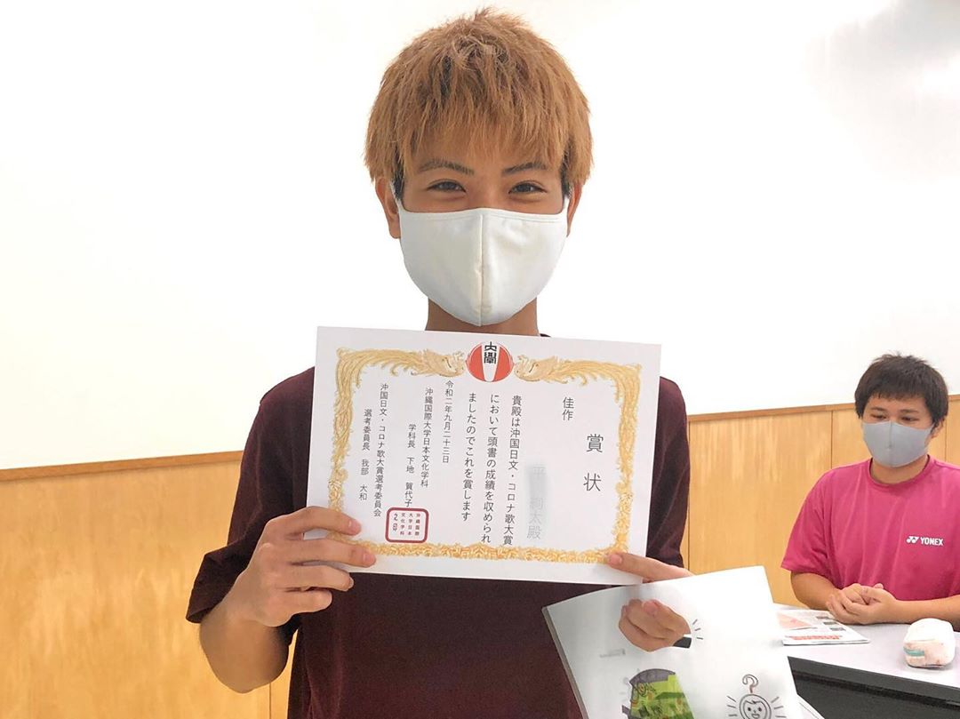 9月23日に対面形式で開催された1年生後期オリエンテーションにて、前期のリモート授業を使って開催された、「沖国日文・コロナ歌大賞」のコンテスト結果が発表され、下地学科長より受賞者への賞状授与式も行われました。