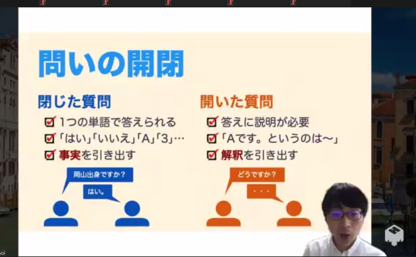 ワークの中では、問いの分類(開いた質問・閉じた質問)や問いの展開の仕方(水平展開・垂直展開)についても学ぶことができたのですが、「インタビューの仕方の練習になった!」という感想も見られました。