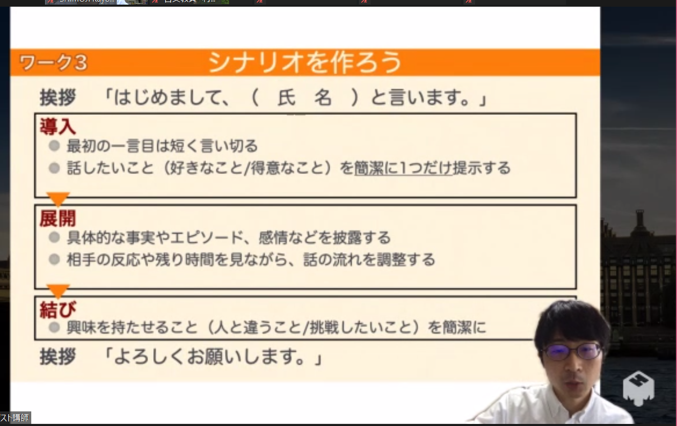 「自己紹介」を題材に、グループ・ワークを交えながら3つのワークに取り組みました。