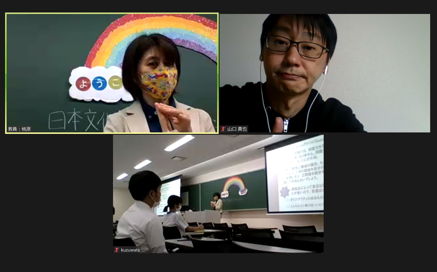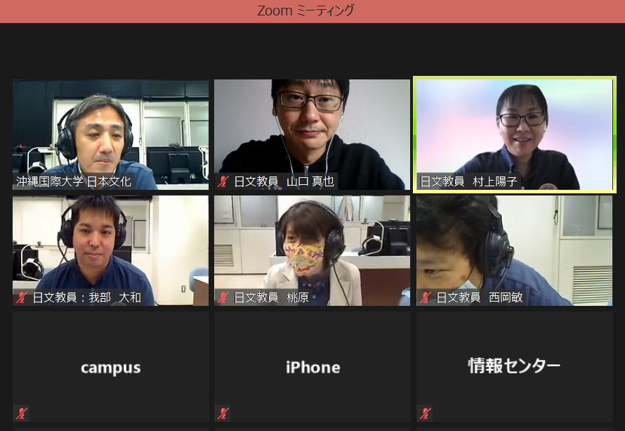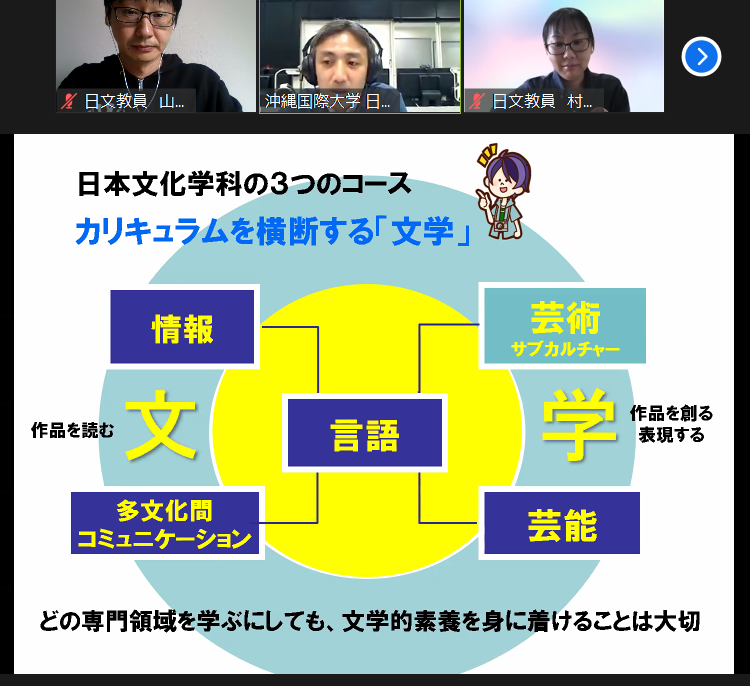 対面形式での開催の後は、対面で参加が難しい方やⅠ・2年生、保護者向けに、11時30分からはWEBでの学科紹介も行いました。担当は、多文化間コミュニケーションコース担当の奥山貴之先生。ほかにも、文学担当の村上先生、琉球文化担当の我部先生、琉球語学担当の西岡先生、教職担当の桃原先生など、日文の先生方も勢ぞろい。図書館情報学担当の山口先生も学外研修中の東京から参加して、1・2年生向けに、各学問分野の面白さや進路選択で気を付けてほしいことなどをお話ししました。