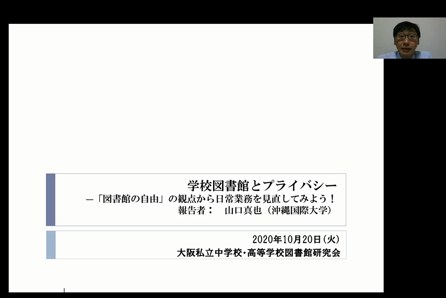 10月20日、日本文化学科で図書館情報学の授業を担当している山口真也先生が、大阪市立中学校・高等学校図書館研究会の研修会講師として大阪に招かれ、「学校図書館とプライバシー」と題する講演を行いました。