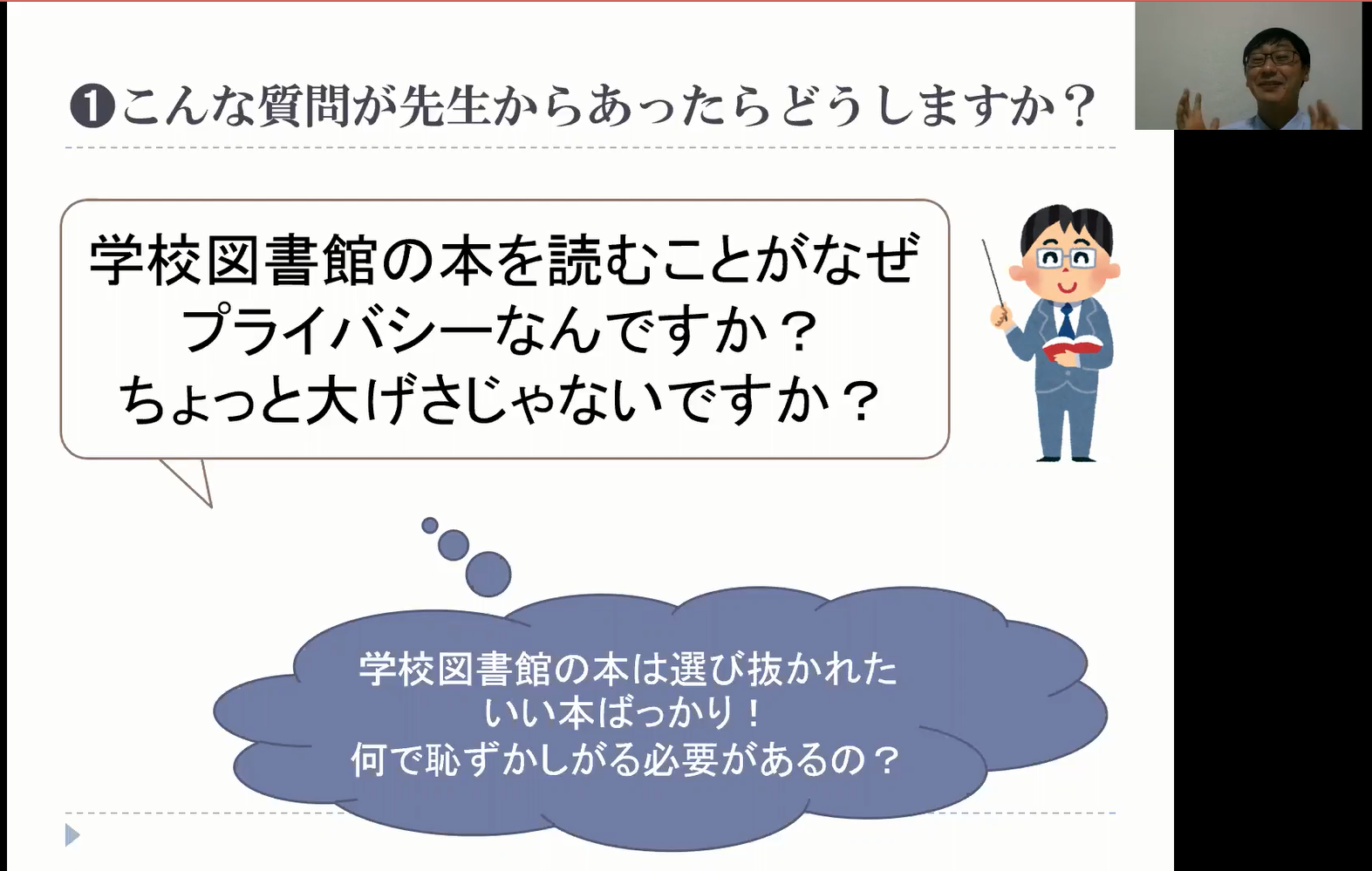 少し技術的なトラブルもありましたが、「貸出記録は残っていますか?」「クラス担任の先生などに貸出記録を求められたことはありますか?」「求めに応じて見せたことはありますか?」といった山口先生からの質問へ、参加者の方からたくさんの回答が寄せられ、山口先生も学校図書館の現状がリアルに分かってとても参考になりました、と感想を述べていました。