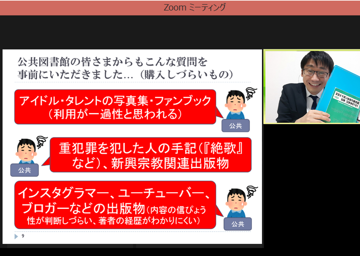 講演会では事前に参加者(公共図書館・学校図書館司書のみなさん)からアンケートをとり、選書の悩みを伺いました。
