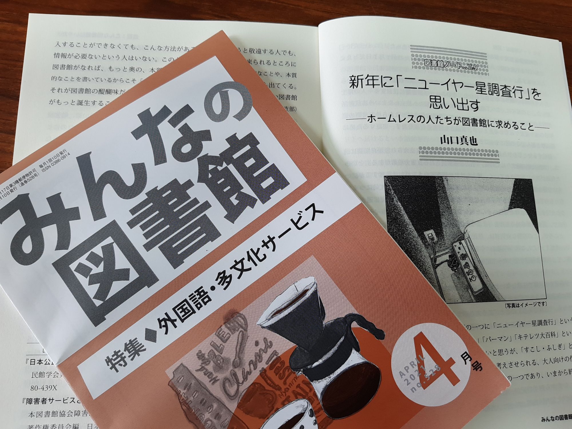 2021年4月号は連載9回目(第1期を含めると通算61回目)で、今回のタイトルは「新年に「ニューイヤー星調査行」を思い出す」で、サブタイトルは「ホームレスの人たちが図書館に求めること」です。