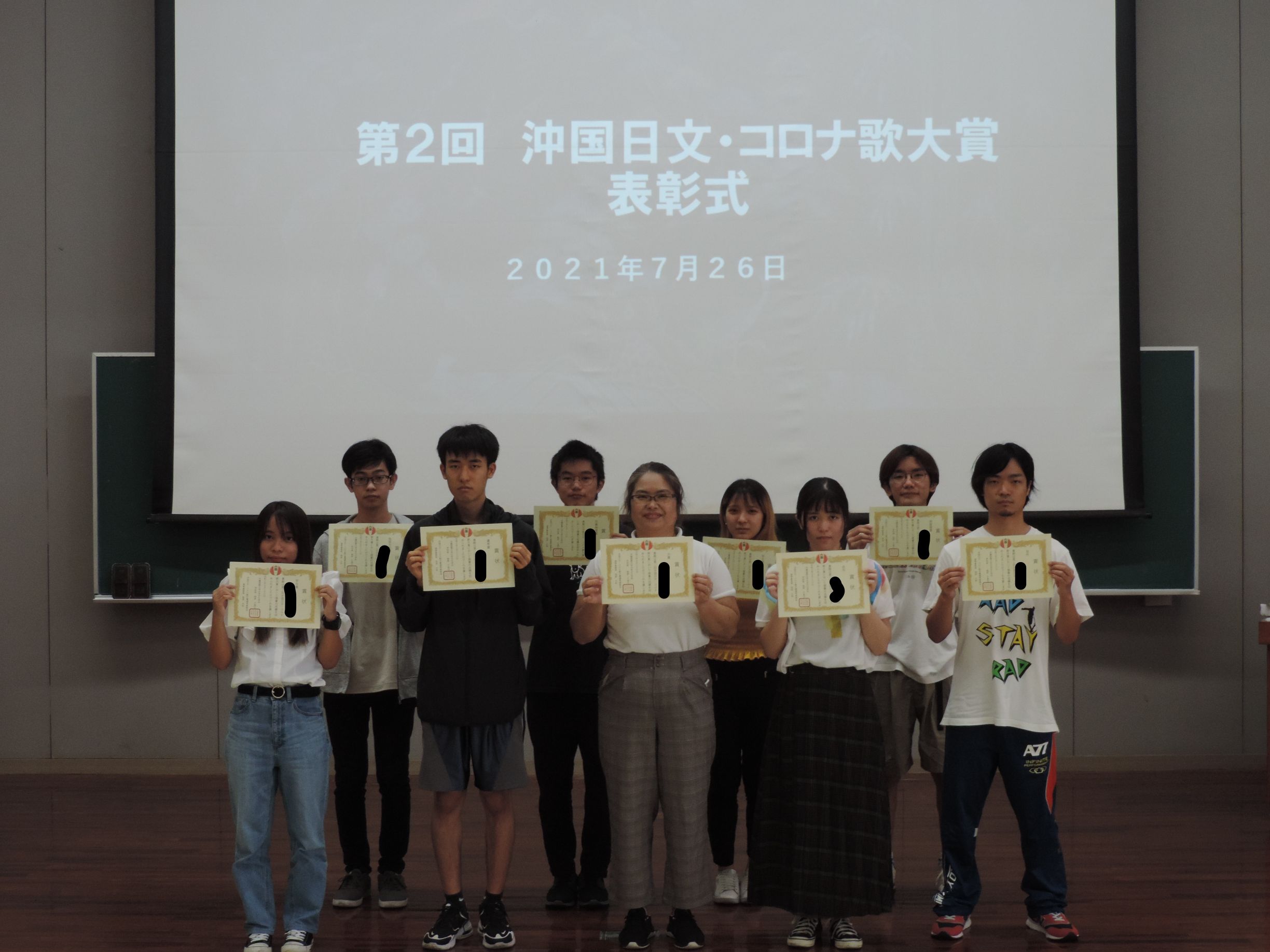 7月26日に琉球文化論の講義内で開催された「第2回沖国日文・コロナ歌大賞」の結果が発表され、我部先生より受賞者への賞状授与式も行われました。