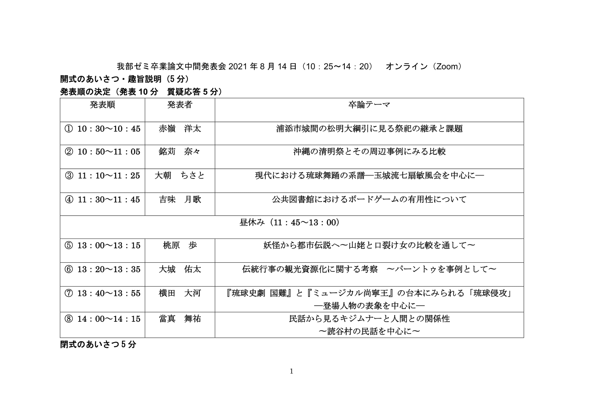 8月14日に琉球文化コースを担当している我部先生のゼミで卒業論文の中間発表会をオンラインで行いました!