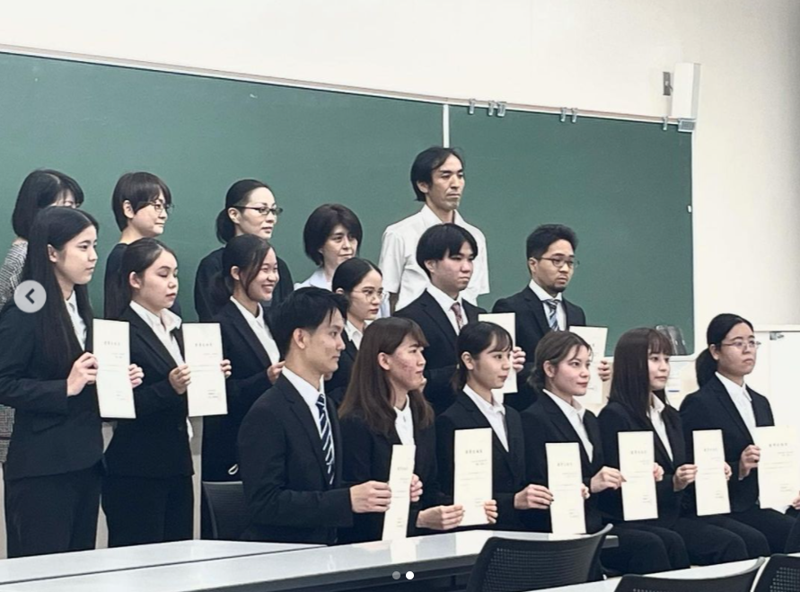 授賞式では学部長からのお祝いの言葉がかけられ、授賞式終了後は、学科長の桃原千英子先生らと一緒に記念撮影をしました。