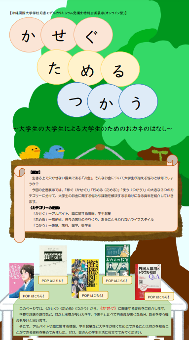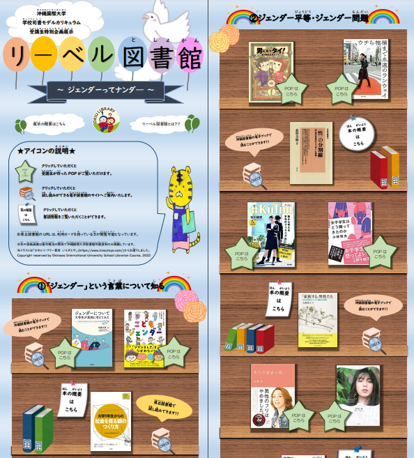 後期に開講されている「学校図書館情報サービス論」という科目では、学校図書館の教育活動、サービスとして多く行われている「テーマ展示」を学ぶために、沖縄国際大学の図書館を活用した展示実習を行いました。