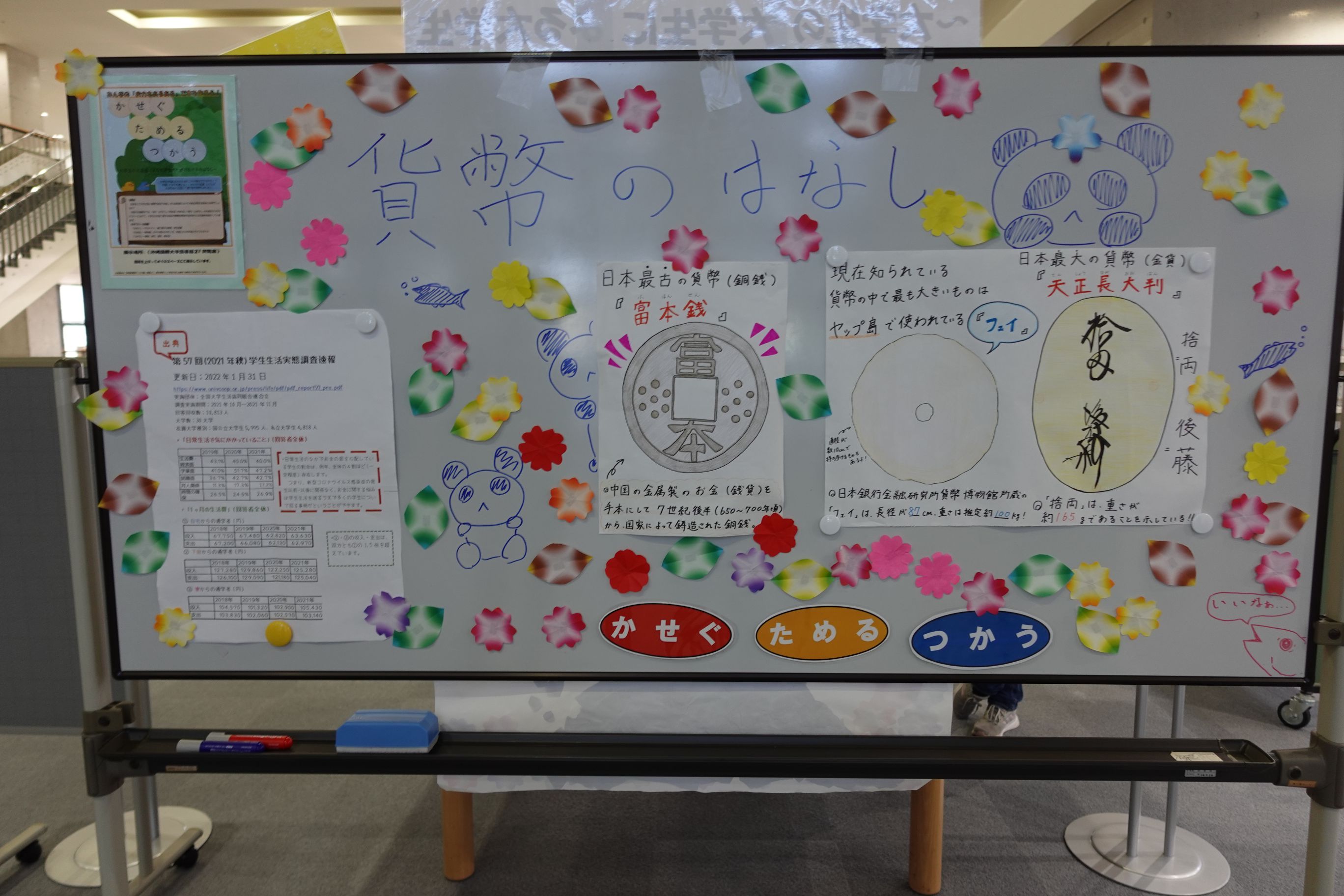 展示コーナーは、図書館2Fの階段を上ったフロアの中央に設置しています。そのため、タイトルボードの裏面が寂しくなってしまわないように、裏面にも、お金にまつわるエトセトラ、ということで、貨幣の歴史などの豆知識や、大学生の出費についての生活実態調査の結果などをまとめたポスターを掲示し、発信型の展示を行ってみました。