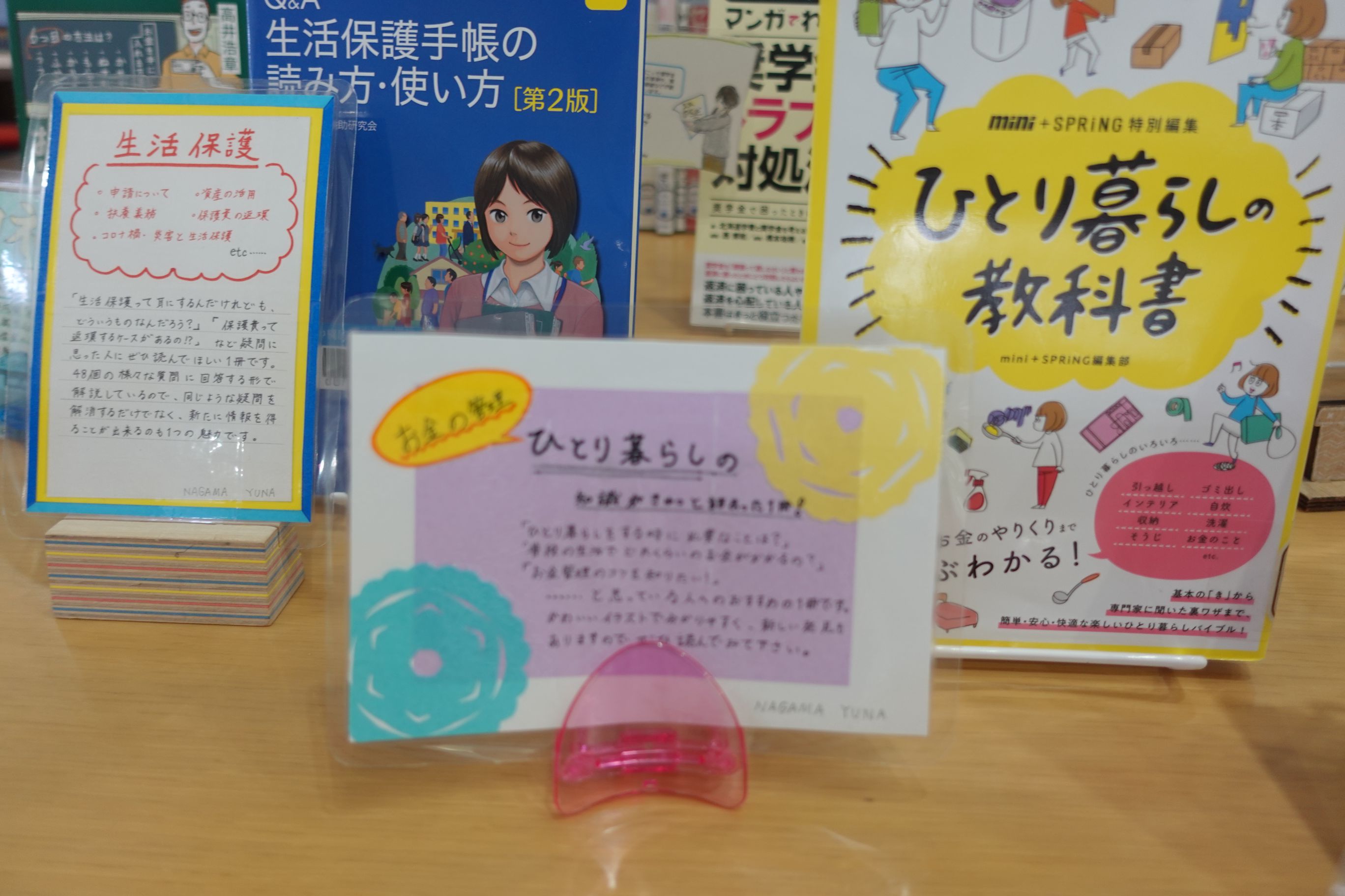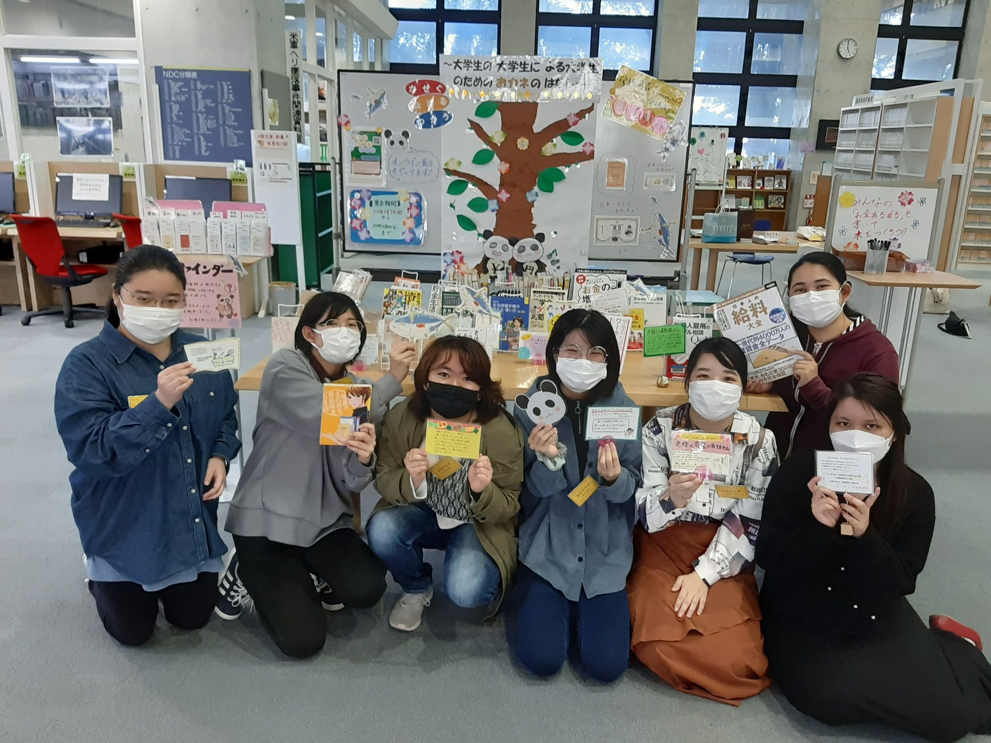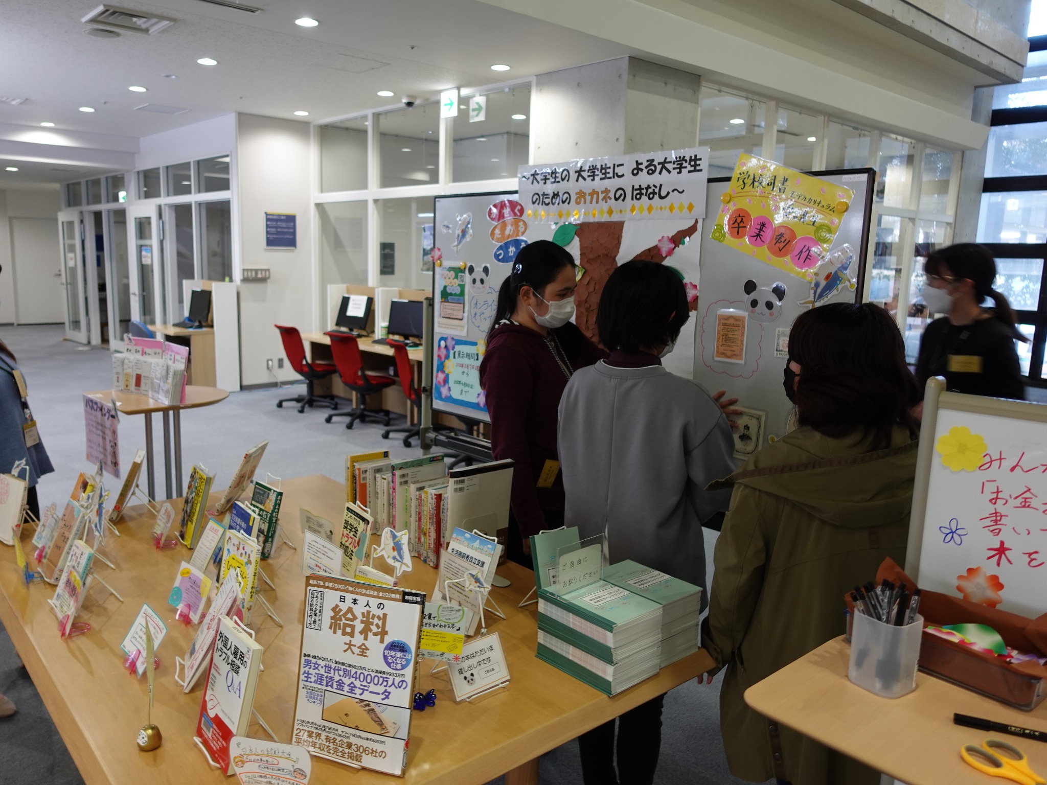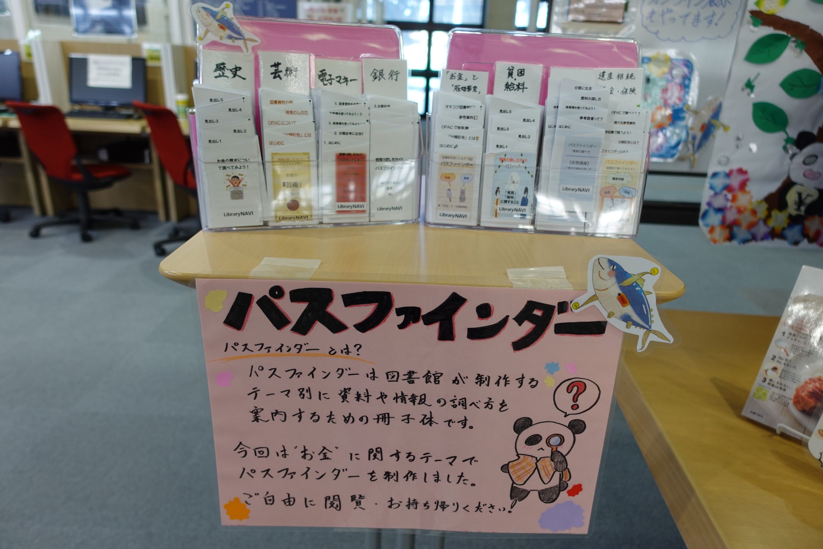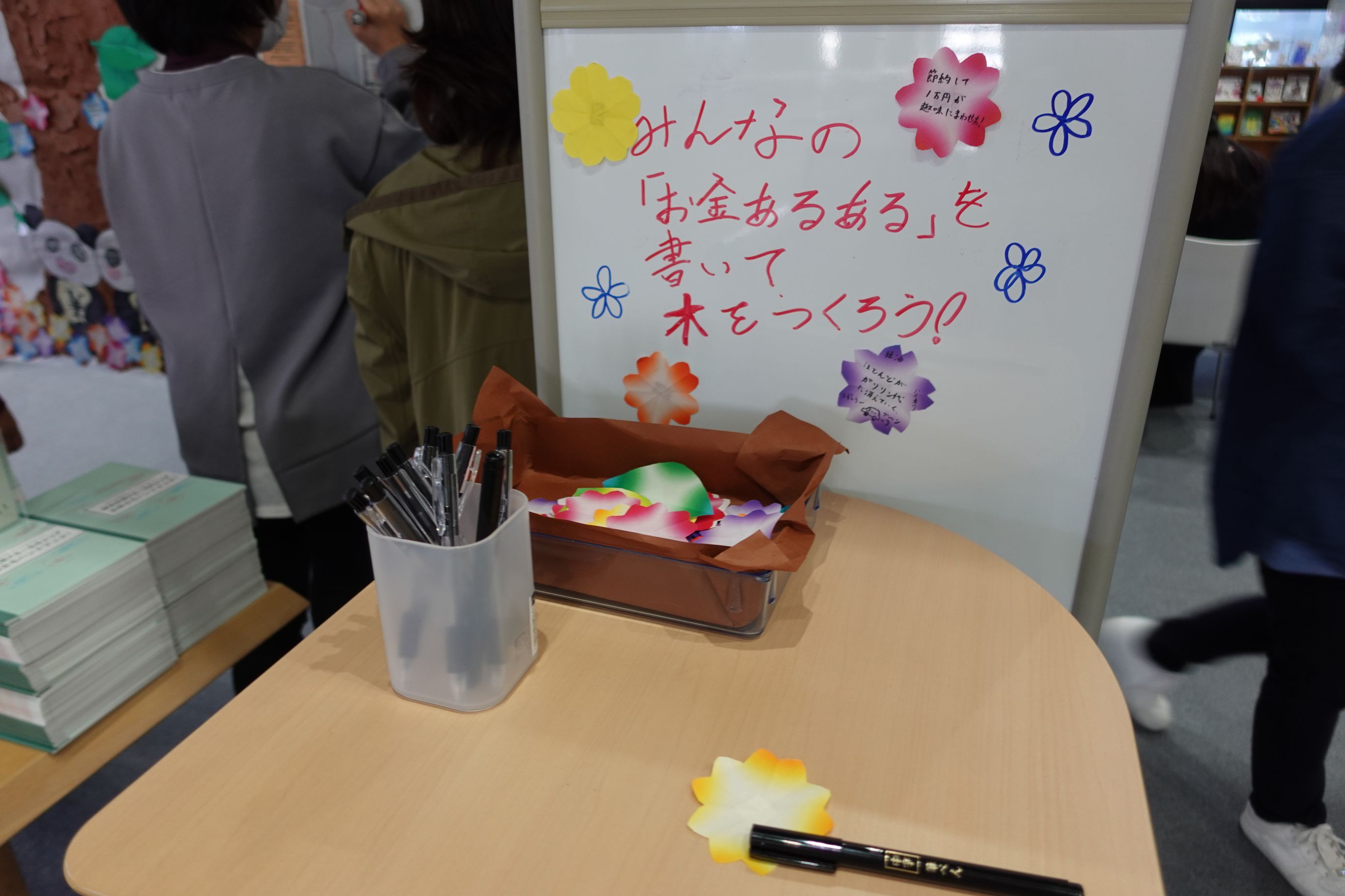 例えば、お薦めの本を紹介するPOPを作ったり、展示では紹介しきれなかった「お金」に関わるジャンルの資料をガイドする「パスファインダー」を作ったり、さらに、タイトルボードには、大きな木のオブジェを作り、「大学生のお金あるある」を小さな花形・葉っぱ型のカードに書いて、それをボードに貼り付けてもらう、参加型の展示を考えたり、お金の使い方を学ぶガイドブックを取り寄せて配布したり。