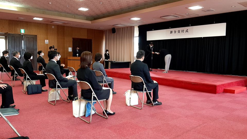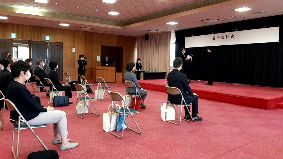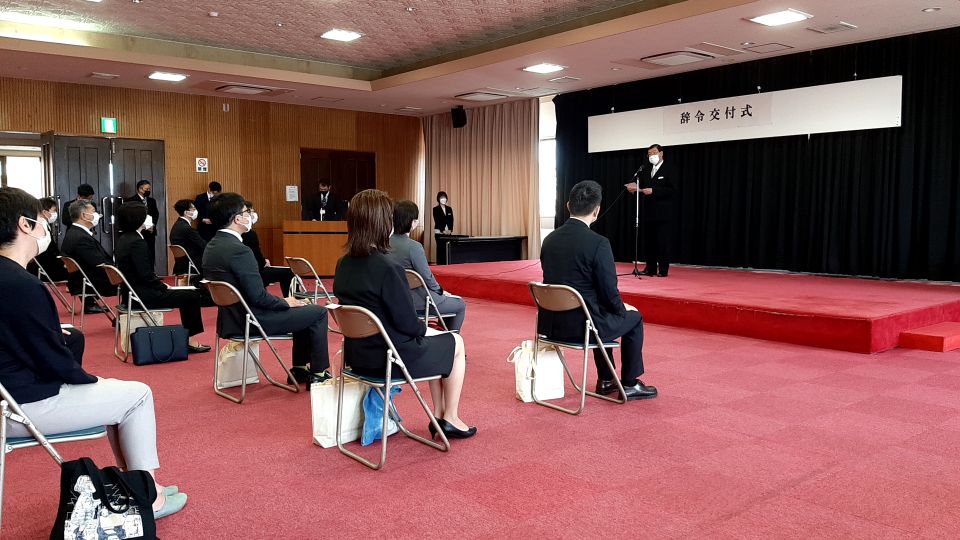 辞令交付式では、前津学長より、「沖縄国際大学の一員として、教育、研究、そして地域貢献という職務に務めてください」という言葉がありました。
